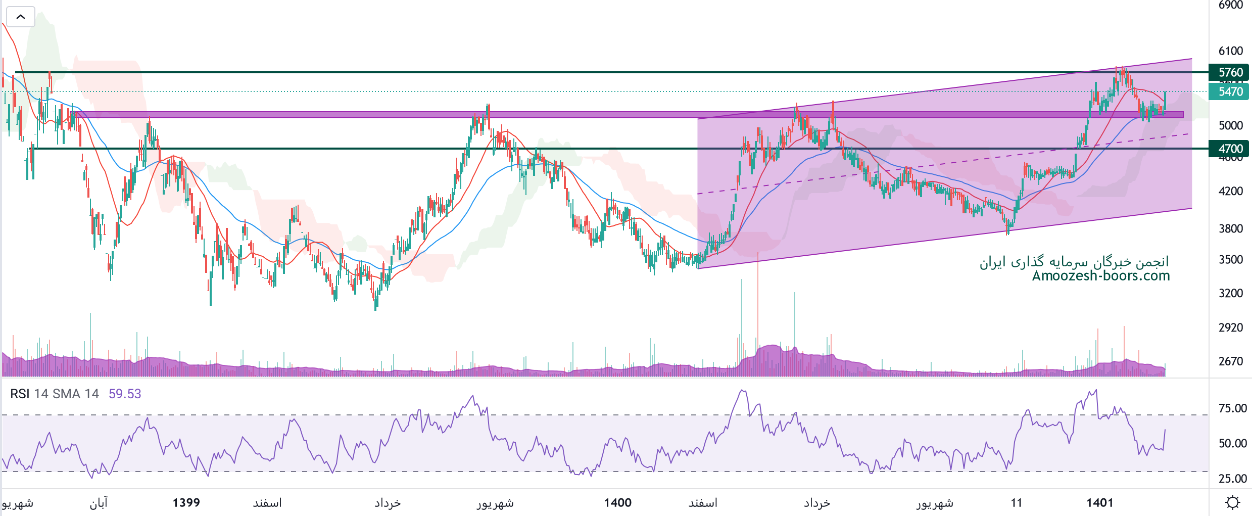 نماد و مهان حمایت 5100 ریال و مقاومت 5670 ریال را دارا میباشد، درصورت از دست رفتن محدوده حمایتی، اولین حمایت سهم 4700 ریال ارزیابی خواهد شد، همچنین در صورت، ادامه دار شدن فشار خرید و عبور از مقاومت، حرکت سهم تا 5760 ریال محتمل خواهد بود.