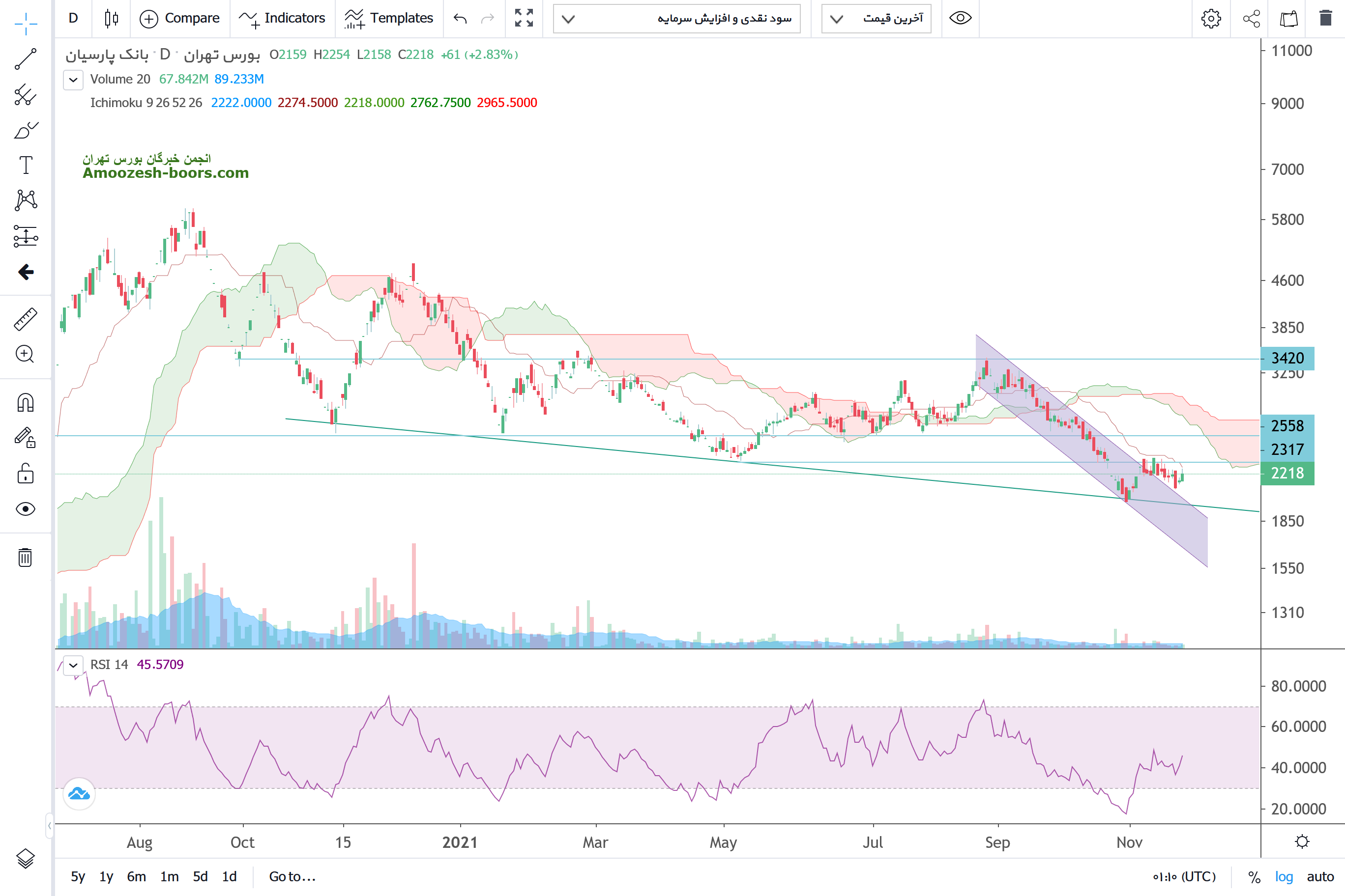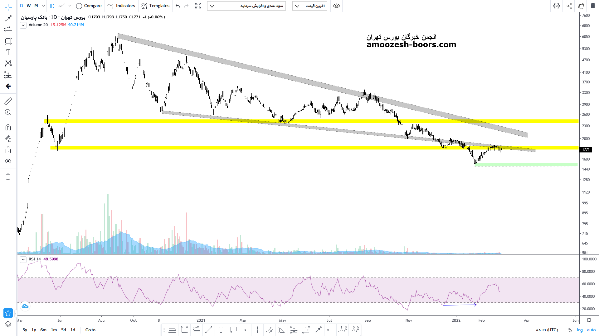 قیمت پس از شکست حمایت مهم محدوده ۱۸۰ تومان ریزش خود را تا محدوده حمایتی ۱۵۰ تومان ادامه داده و پس از رشدی اکنون با مقاومت محدوده ۱۸۰ تومان درگیر است در صورت توانایی قیمت در شکست این محدوده مقاومتی مهم هم می تواند رشد خود را تا خط روند نزولی و سپس در صورت شکست آن تا حدود ۲۵۰ تومان نیز ادامه دهد اما در صورت برگشت و عدم توانایی در شکست این محدوده مقاومتی مجدداً قیمت محدوده ۱۵۰ تومان را تست خواهد کرد