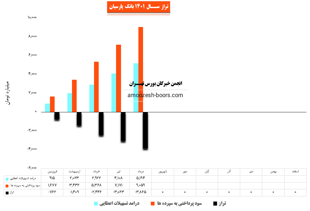سهم وپارس (بانک پارسیان) در دوره یک ماهه منتهی به 30 مهر ماه 1401، مبلغ 1,149.4 میلیارد تومان از محل سود تسهیلات خود درآمد داشته 8 درصد کمتر از شهریور ماه است. و مبلغ 1,967.3 میلیارد تومان سود سپرده پرداخت نموده است که این رقم مشابه ماه قبل گزارش شده است . وپارس در این دوره تراز منفی 817.9 میلیارد تومان (42-%) را ثبت کرده است. تراز سهم وپارس در این دوره نسبت به ماه قبل 14% کاهش و نسبت به میانگین ماه های قبل 7% کاهش داشته است. بانک نسبت به دوره 1 ماهه مشابه سال قبل 33% کاهش تراز داشته است.