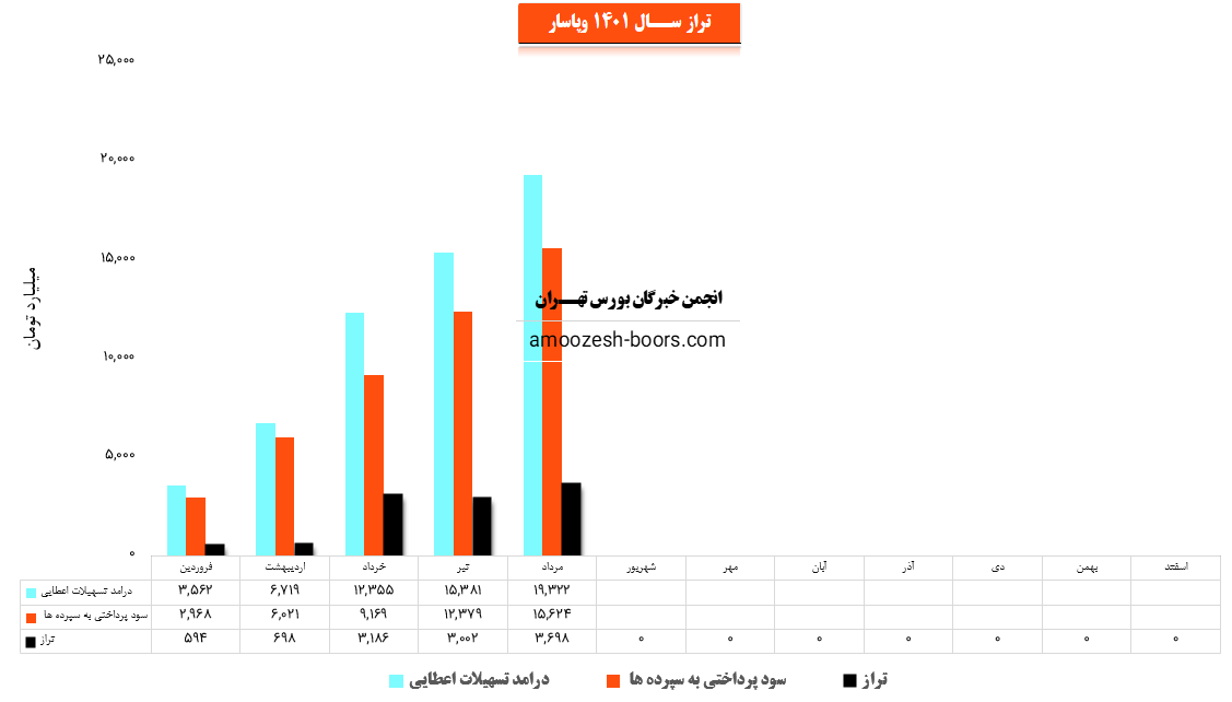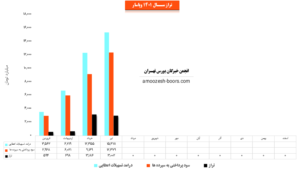 همچنین این نماد وپاسار در تیر ماه مبلغ 12379 میلیارد تومان به سپردههای خود سود پرداخت کرده که این میزان با افزایش 35 درصدی نسبت به ماه گذشته روبرو شده و لذا با توجه به آمار مذکور تراز این وپاسار با 6% کاهش نسبت به ماه گذشته به 3002 میلیارد تومان رسیده است.