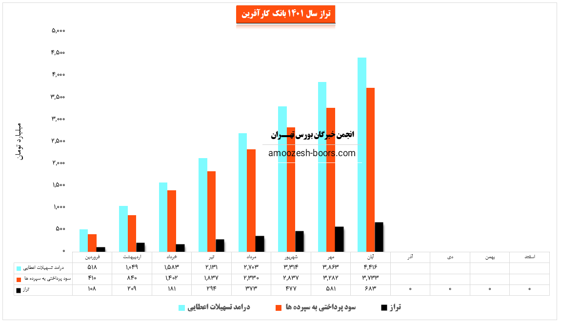 سهم وکار (بانک کارآفرین) در آذرماه سال 1401 حدود مبلغ ۵۶۰ میلیارد تومان از محل تسهیلات اعطایی به افراد درآمد داشته است. همچنین نماد وکار در آذر ماه حدود مبلغ ۴۷۵ میلیارد تومان به سپرده های خود سود پرداخت کرده که منجر به ثبت تراز مثبت ۸۵ میلیارد تومانی در آذر ماه شده است.