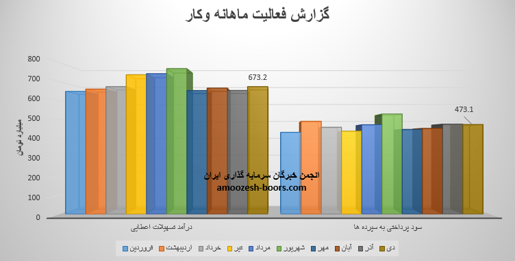 سهم وکار (بانک کارآفرین) در مهر ماه مبلغ 549.5 میلیارد تومان از محل سود تسهیلات خود درآمد داشته و مبلغ 445.5 میلیارد تومان سود سپرده پرداخت نموده است. نماد وکاردر این دوره تراز مثبت 103.9 میلیارد تومان (23%) را ثبت کرده است. تراز بانک در این دوره نسبت به ماه قبل 1% کاهش و نسبت به میانگین ماه های قبل 2% افزایش داشته است. همچنین وکار نسبت به دوره 1 ماهه مشابه سال قبل 15% کاهش تراز داشته است.