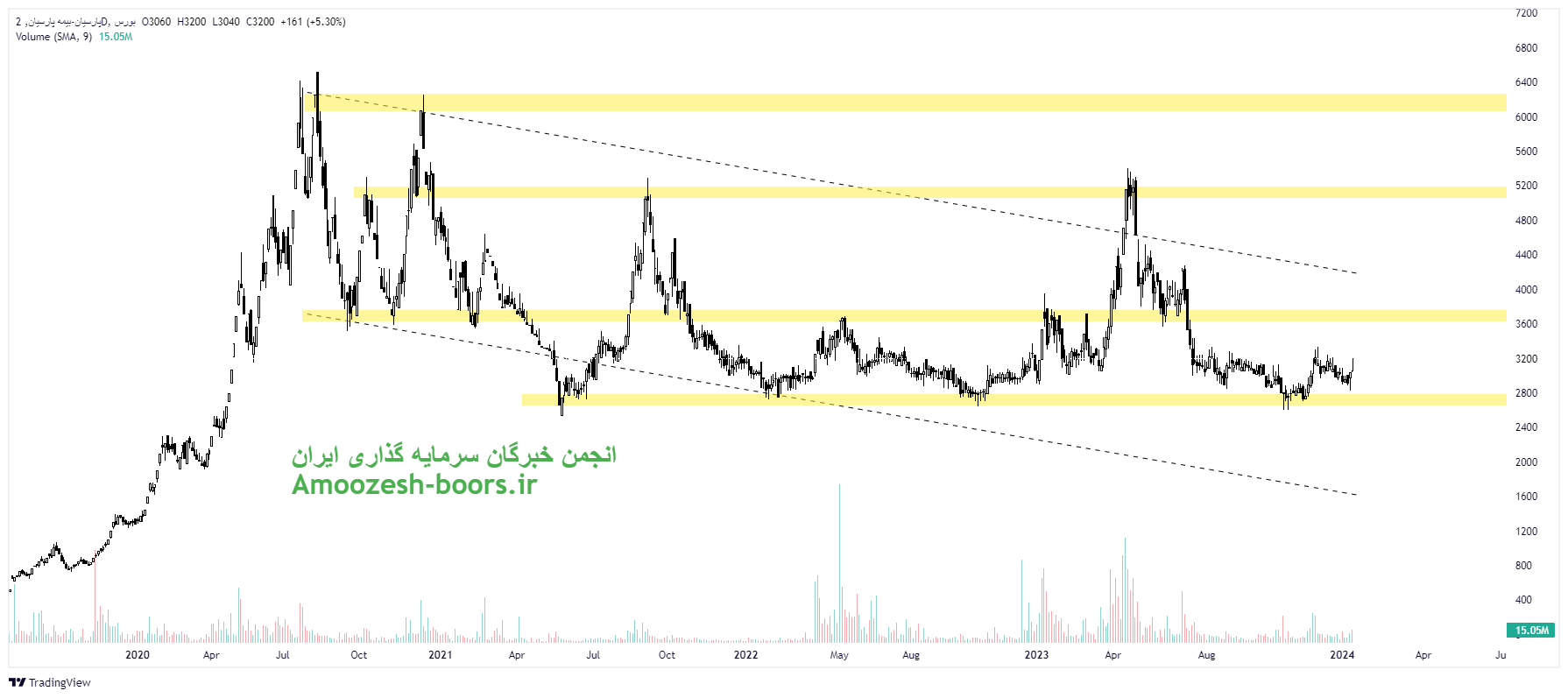 قیمت سهم پارسیان بر روی حمایت مهم و قوی ناحیه ۲۸۰ تومان قرار گرفته است لذا در صورت حفظ ناحیه و ایجاد تقاضا در کلیت بازار، حرکت سهم پارسیان به سمت مقاومتهای ۳۷۰ و ۵۳۰ تومان ادامه خواهد داشت. اما در صورت عدم ایجاد تقاضا و از دست رفتن حمایت ناحیه ۲۸۰ تومان حمایت بعدی سهم پارسیان ناحیه ۲۱۰ تومان در نظر گرفته شده است.