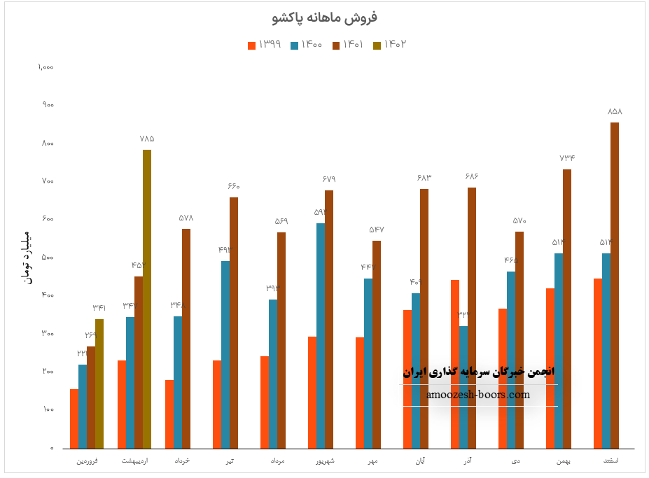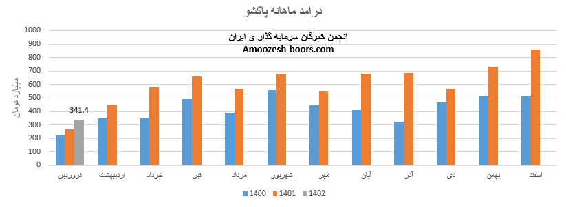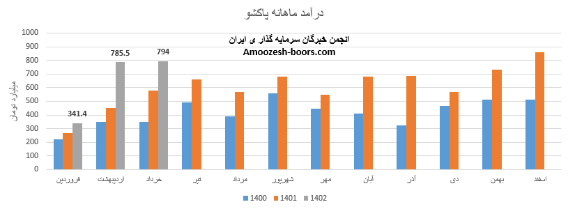 نماد پاکشو (شرکت تولیدی و شیمیایی پاکشو) در اردیبهشت ماه سال 1402 حدود مبلغ 785 میلیارد تومان درآمد داشته که این میزان در مقایسه با ماه گذشته 130% و همچنین در مقایسه با مدت مشابه سال گذشته 74% رشد پیدا کرده است.
