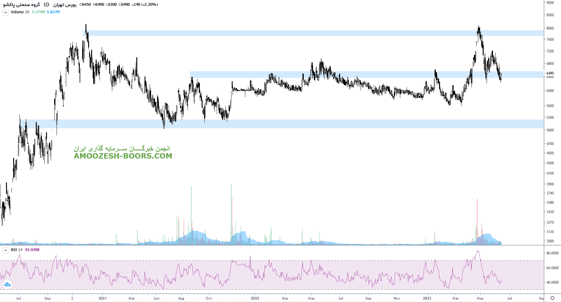 قیمت سهم پاکشو پس از برخورد به مقاومت تاریخی سقف 800 تومان و بروز واکنش منفی نسبت به این ناحیه مقاومتی وارد اصلاح شده و اکنون بر روی ناحیه حمایتی ۶۵۰ تومان قرار گرفته است لذا در صورت حفظ این ناحیه حرکت سهم تا مقاومت سقف تاریخی ۸۰۰تومان ادامه خواهد داشت اما در صورت از دست رفتن این ناحیه حمایتی، حرکت اصلاحی تا کف کانال رنج ۵۰۰ تومان ادامه خواهد داشت.