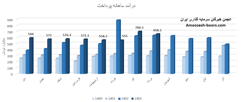 بر اساس صورت مالی و عملکرد ماهانه سهام پرداخت که در کدال منتشر شده، این شرکت در این ماه توانسته به درآمد 658 میلیارد تومان دست یابد، این عدد در مقایسه با ماه گذشته تغییر 6%-، در مقایسه با متوسط ماهانه 112%+ و در مقایسه با مدت مشابه 4%+ داشته است.