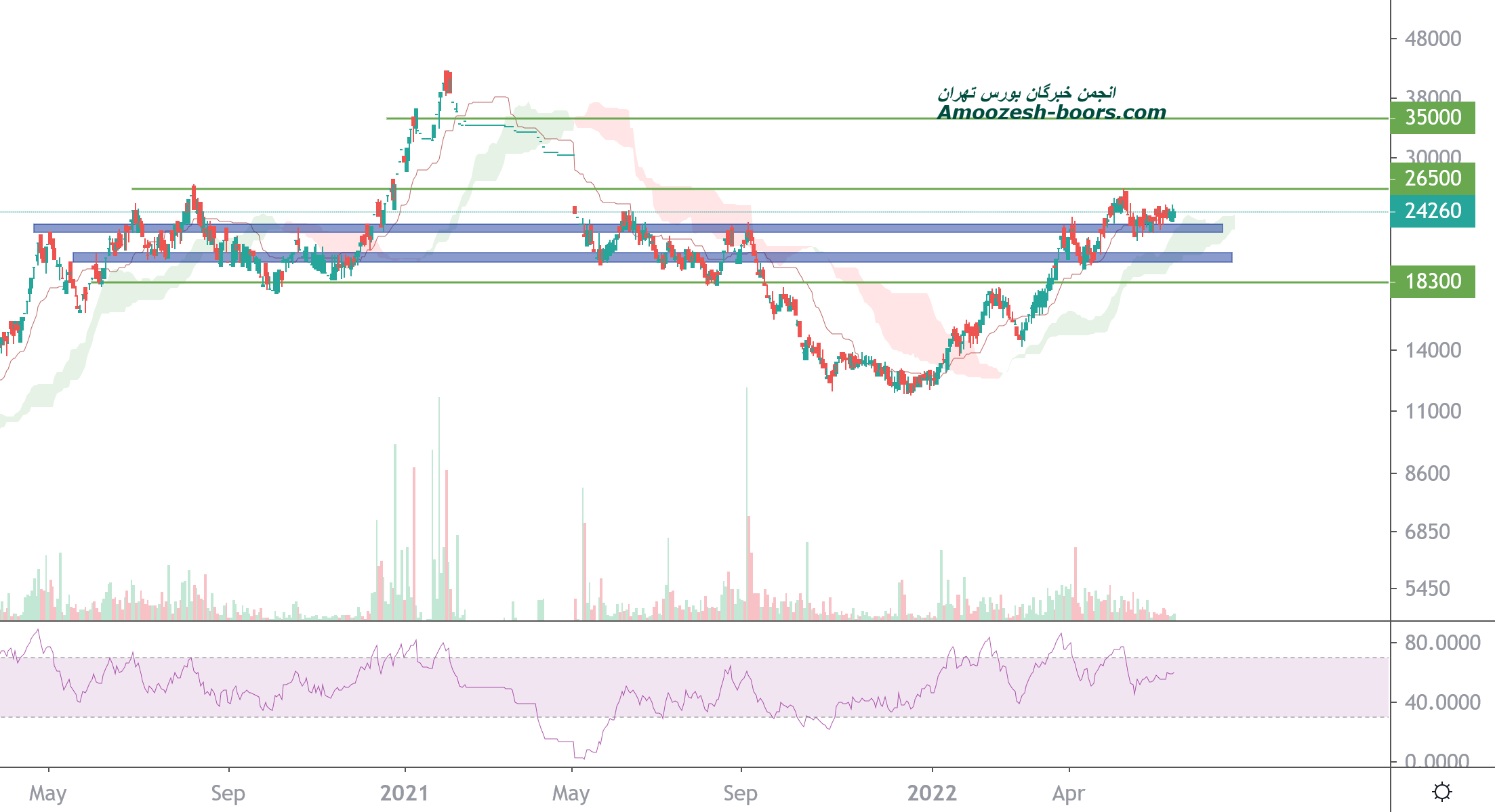درحال حاضر قیمت در محدوده حمایتی 22200 ریال و مقاومتی 26500 ریال قرار دارد،در صورت از دست رفتن حمایت،حمایت بعدی 20000 ریال در نظر گرفته خواهد شد که حد ضرر فعال میشود،همچنین در صورت تثبیت قیمت و عبور از مقاومت حرکت قیمت تا 35000 ریال محتمل خواهد بود.
