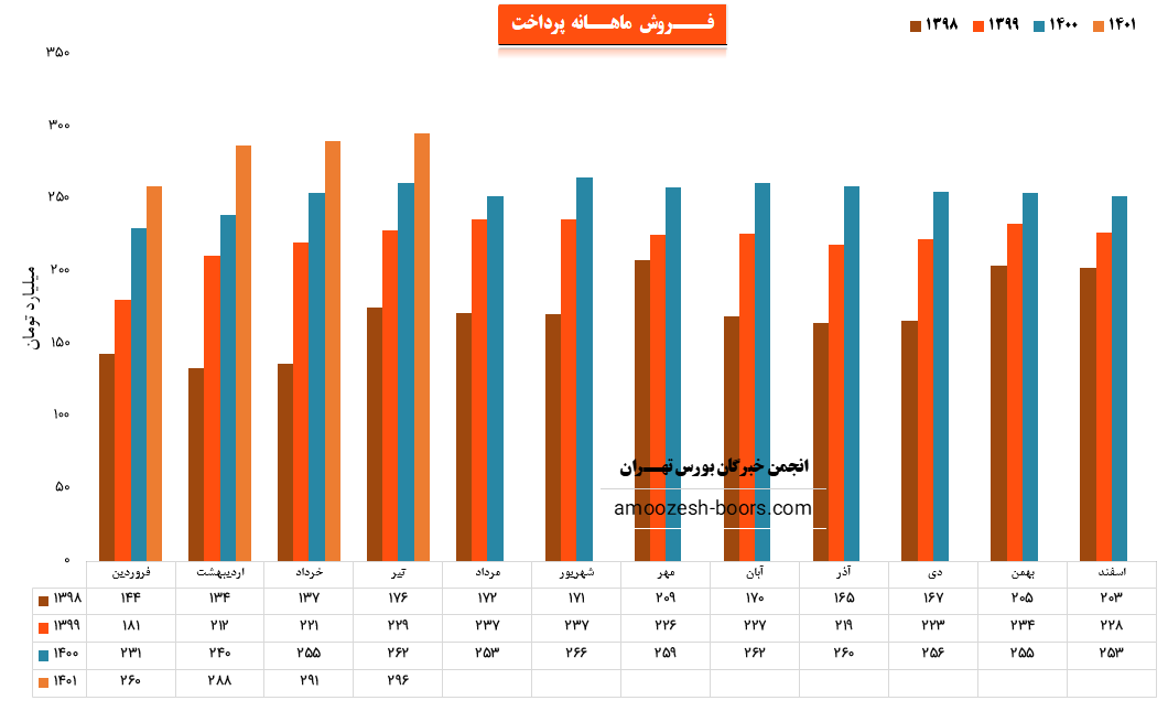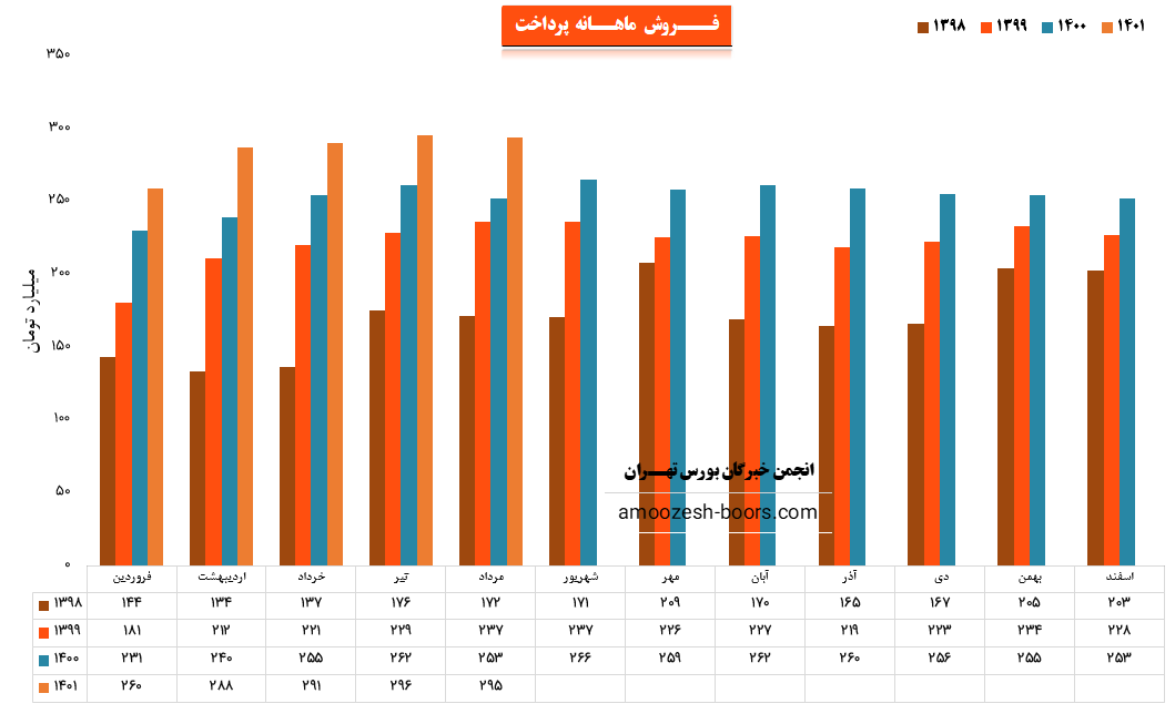به پرداخت ملت در دوره یک ماهه منتهی به فروردین ماه 1401، مبلغ 260.3 میلیارد تومان درآمد های مربوط به فروش و ارائه خدمات داشته است. شرکت نسبت به دوره 1 ماهه مشابه سال قبل 13% افزایش درآمد داشته است.مبلغ فروش شارژ شرکت در این ماه با کاهش 2 درصدی نسبت به اسفند 145 میلیارد تومان رسیده است.