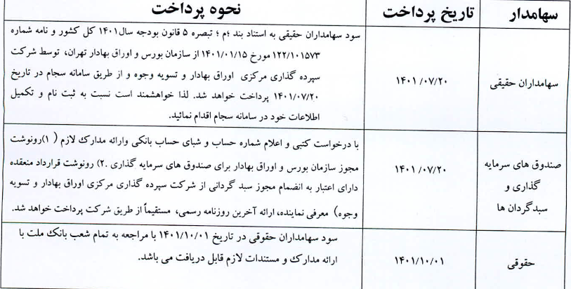 احتراماً به استحضار می رساند زمان بندی پیشنهادی هیئت مدیره در خصوص پرداخت سود به دارندگان سهام در تاریخ مجمع عمومی عادی سالیانه منتهی به اسفند ماه سال ۱۴۰۰ بر اساس جدول زمانبندی زیر تقدیم می گردد: