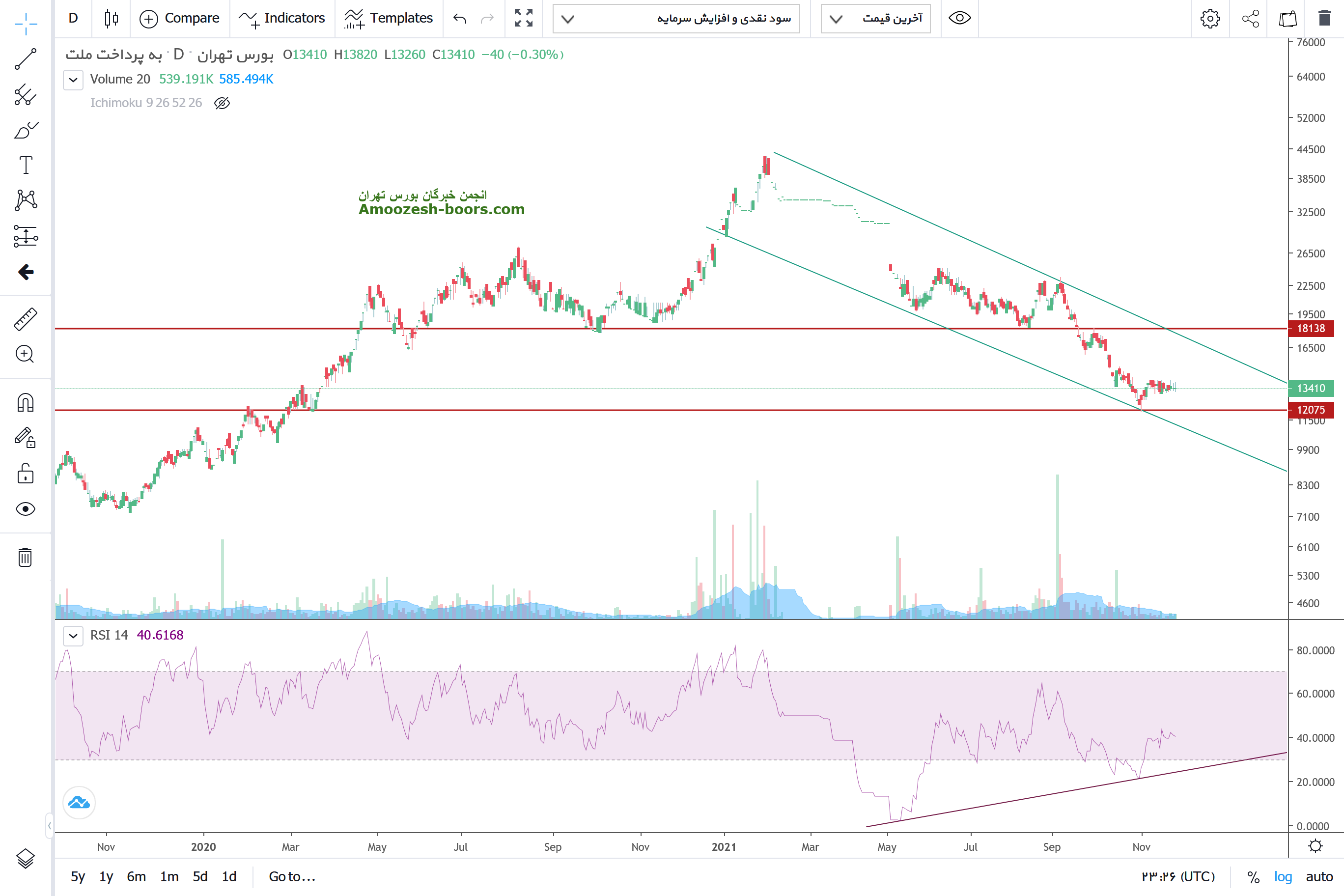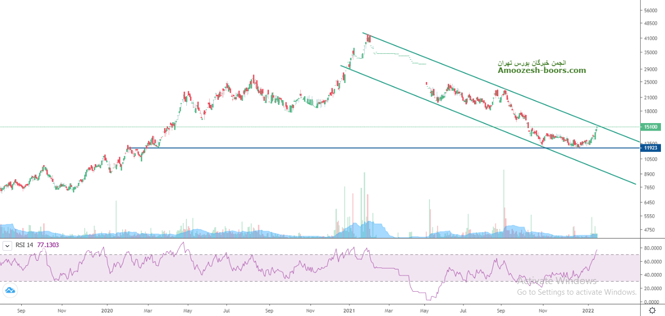 قیمت با ایجاد واگرایی منفی به سقف کانال نزولی و مقاومت روانی عدد رند 15000 ریال واکنش نشان داده در صورت انجام اصلاح قیمتی ، حمایت 12000 ریال و در صورت شکست کانال مقاومت های 16 و 18و هزار ریال بر سر راه سهم میباشد .