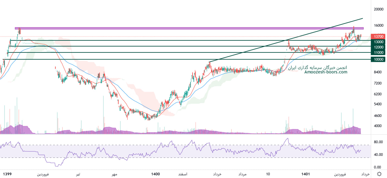 نماد پرداخت در حال نوسان مابین محدوده حمایتی 13000 ریال و محدوده مقاومتی 15000 ریال میباشد، در صورت تثبیت قیمت مقاومت بعدی محدوده 18000 ریال در نظر گرفته خواهد شد، همچنین در صورت از دست رفتن محدوده حمایتی، حمایت بعدی 11000 ریال ارزیابی میگردد.