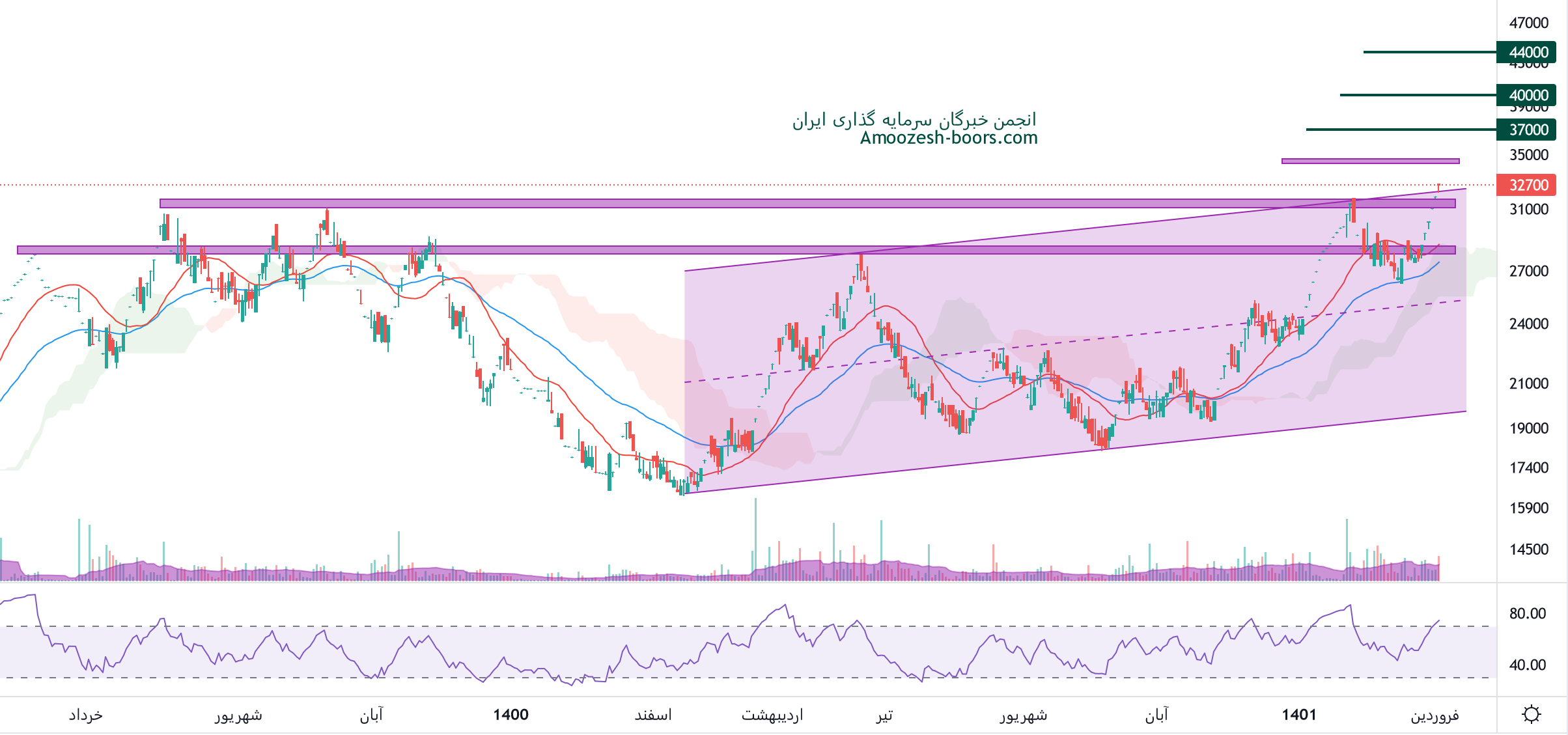 نماد پلوله موفق به عبور از مقاومت محدوده سقف کانال صعودی در قیمت 32500 شده، در صورت تثبیت قیمت سهم پلوله در این محدوده، سهم تا تارگت 37000 ریال سطح مقاومتی 34500 ریال را دارا میباشد، همچنین حمایت سهم، 31000 ریال ارزیابی میگردد، به سهامدران محترم این نماد توصیه میگردد در صورت از دست رفتن سطح قیمتی 31000 ریال اقدام به فروش این نماد نمایند.