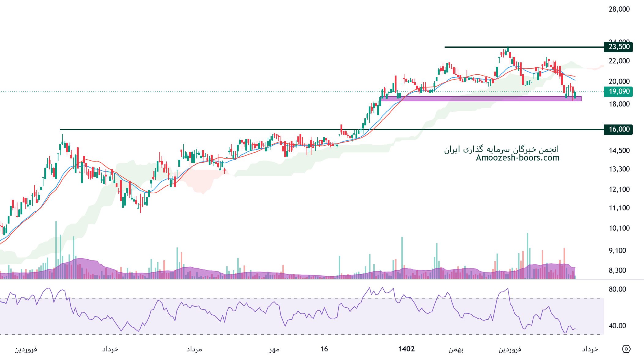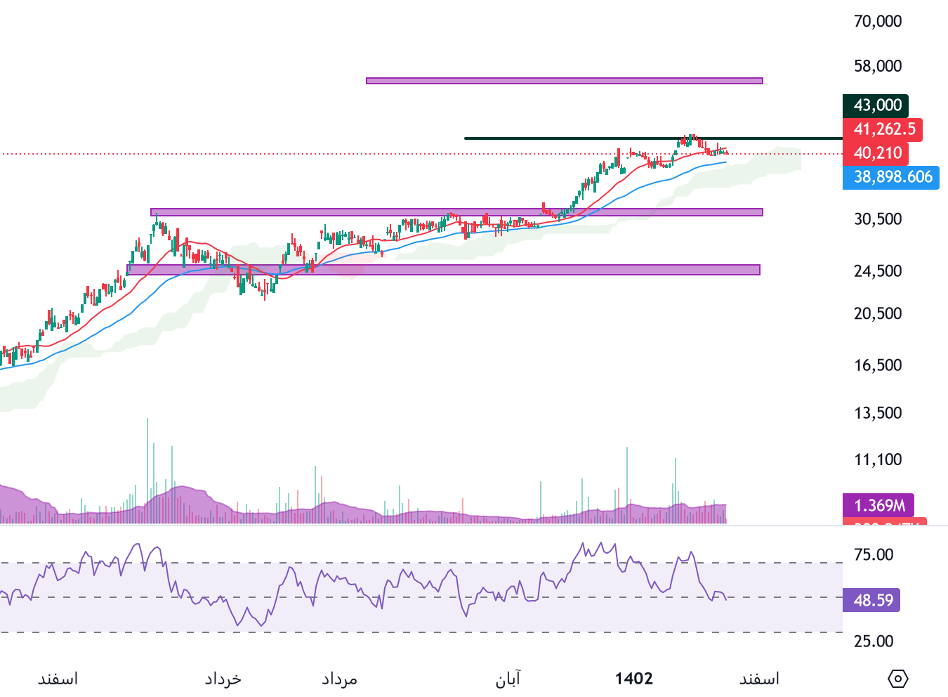 بررسی تحلیل تکنیکال سهم پکرمان نشان میدهد که قیمت در محدوده مقاومتی 43000 ریال قرار دارد، در صورت تثبیت و بیس سازی قیمت در این منطقه و ایجاد نشانه های برگشت مثل کندل های قوی صعودی، میتوان اولین تارگت پکرمان را 55000 ریال در نظر گرفت، همچنین در صورت شدت گرفتن فشار فروش حمایت سهم پکرمان 31000 ریال ارزیابی میگردد.