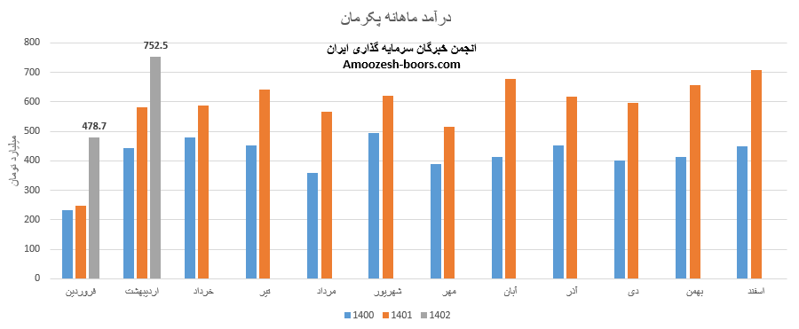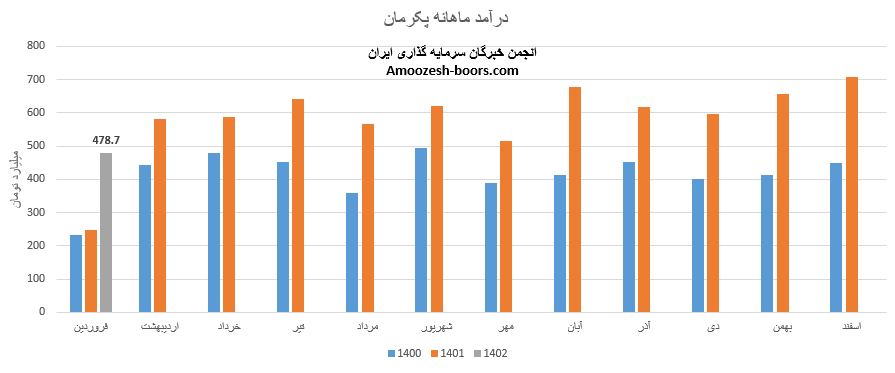 نماد پکرمان در اسفند ماه سال 1401 درآمدی معادل 708.3 میلیارد تومان را محقق نموده که رکورد جدیدی در فروش محصولات این شرکت محسوب میشود، درآمد سهم پکرمان در آخرین ماه از سال مالی، تغییرات زیر را تجربه نموده است، افزایش 8 درصدی نسبت به ماه گذشته، افزایش 23 درصدی نسبت به متوسط ماهانه، افزایش 58 درصدی نسبت به مدت مشابه، پر فروش ترین محصول سهم پکرمان مربوط به تایر رادیال است مه افزایش نرخ 6 درصدی باعث جبران افت مقدار فروش این محصول شده و علت اصلی ثبت رکورد به دلیل افزایش مقدار و نرخ تایر بایاس میباشد، مجموع عملکرد 12 ماهه نماد پکرمان رشد 41 درصدی نسبت به کل درآمد سال قبل دارد.