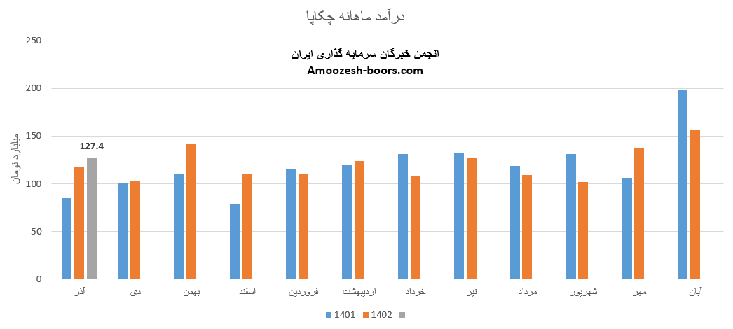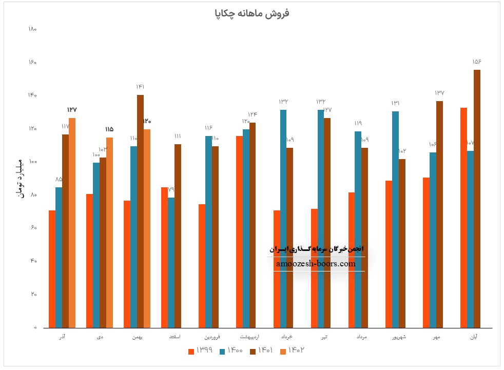 فروش آذر ماه سال 1402 سهم چکاپا 127.4 میلیارد تومان گزارش شده است، تغییرات درآمدی چکاپا به شرح زیر میباشد: