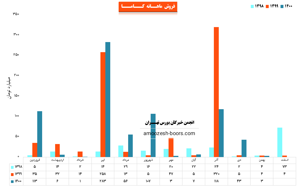 مقدار فروش کاما در خرداد ماه نسبت به اردیبهشت و میانگین ماههای قبل به ترتیب 49٪ و 31٪ افزایش داشته اما از نظر مقدار تولید نسبت به اردیبهشت و میانگین ماههای قبل به ترتیب 24٪ و 32٪ کاهش داشته است.