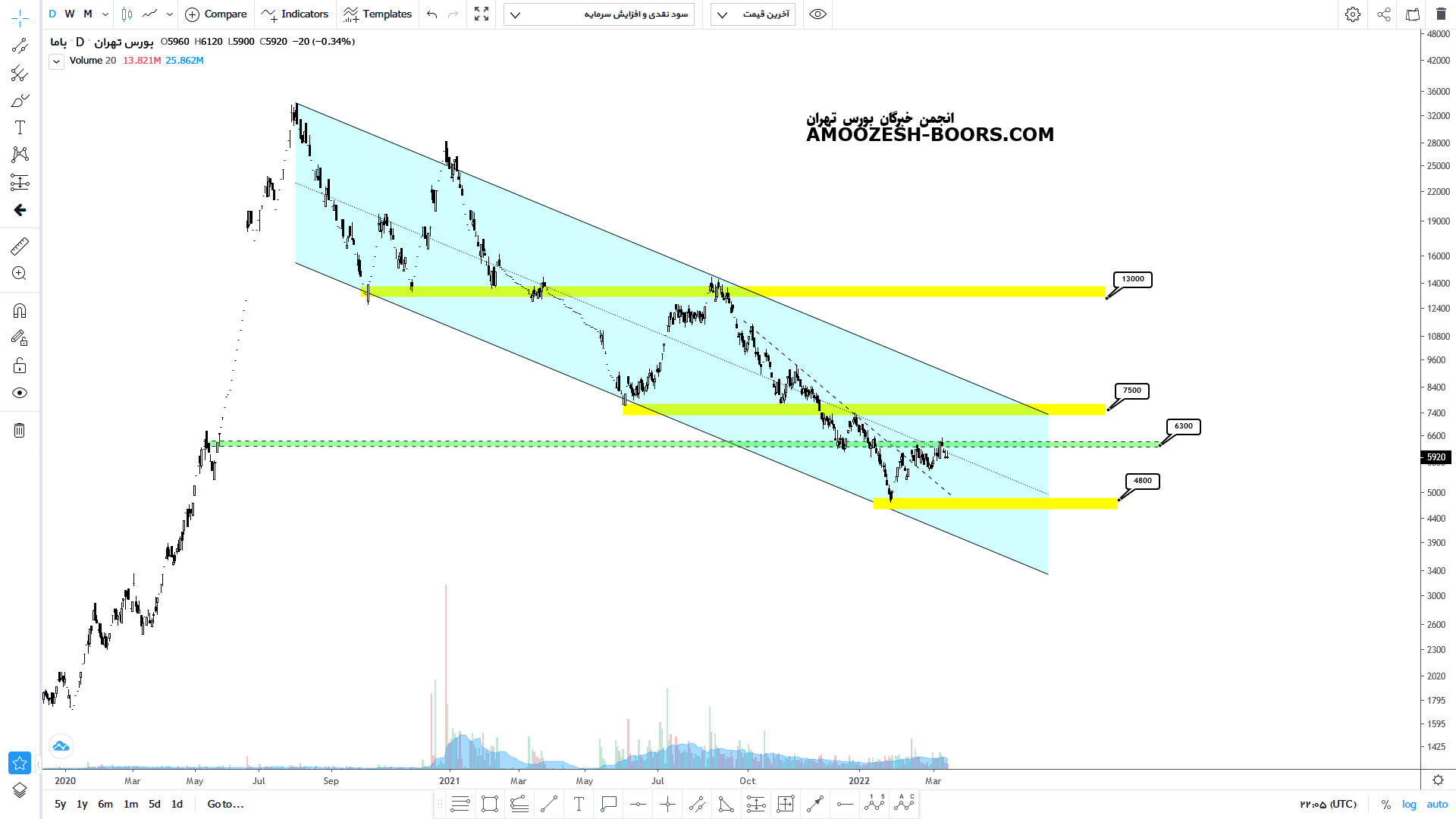 قیمت در حال تثبیت روی محدوده حمایتی استاتیک خود میباشد درصورت ادامه دار شدن صعود اولین مقاومت سهم 7500 ریال در نظر گرفته خواهد شد و همچنین در صورت از دست رفتن حمایت 5000 ریال نزول سهم تا میدلاین کانال دور از ذهن نخواهد بود
