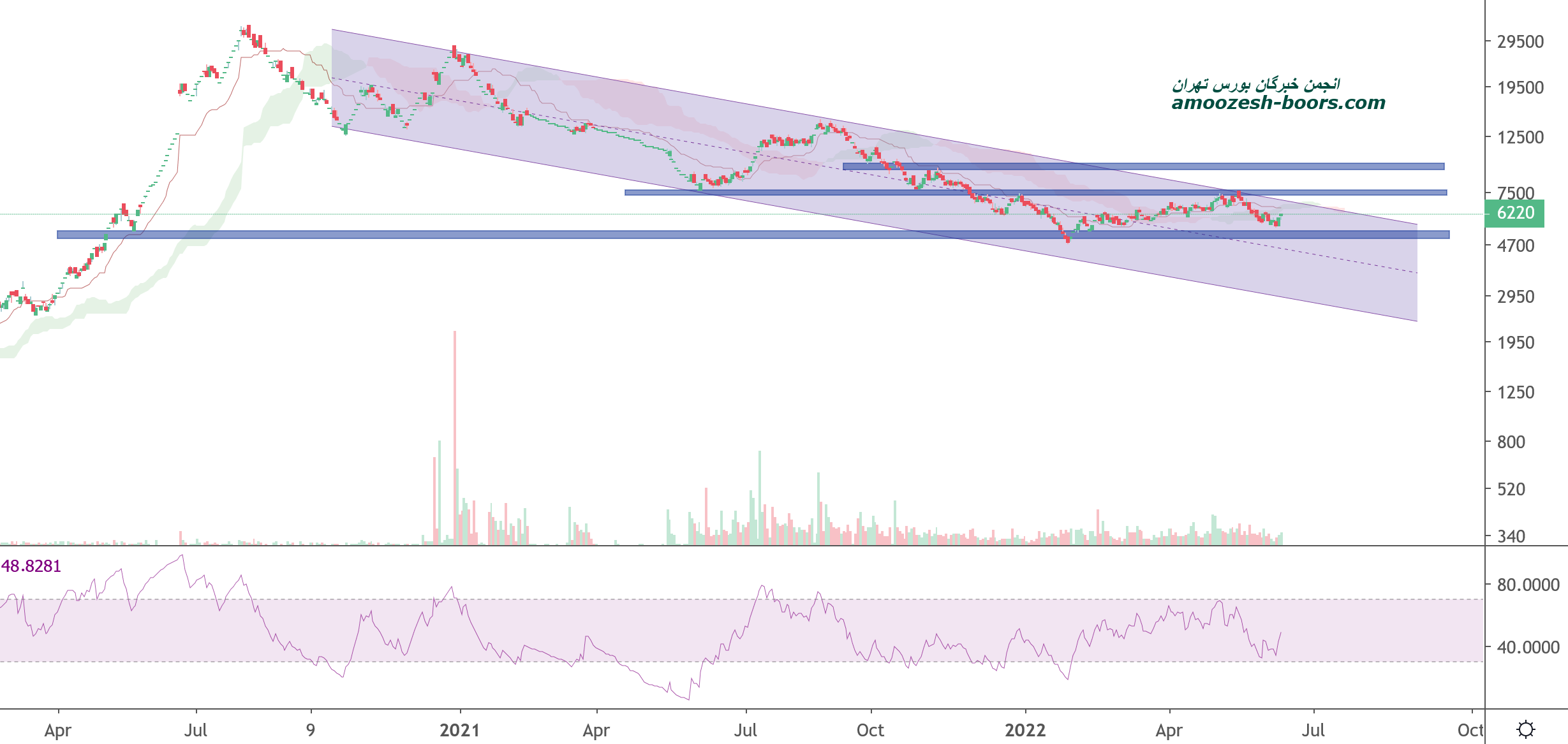 قیمت پس از شکست خط روند نزولی خود پول پولبکی را به خط روند نزولی شکسته شده زده اکنون پس از تایید پولبک مجدد به محدوده مقاومتی ۶۳۰ تومان گیر کرده در صورت نزول بیشتر میتواند کف ۴۸۰ تومان را مجدد تست کند که در صورت شکست آن می تواند تا کف کانال نزولی نیز اول خود را ادامه دهد. اما در صورت توانایی قیمت در شکست محدوده مقاومتی مهم ۶۳۰ تومان میتواند رشد خود را تا محدوده سقف کانال نزولی و مقاومت کلاسیک محدوده ۷۵۰ تومان ادامه دهد.