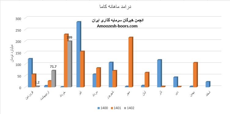 فروش نامنظم نماد کاما در مرداد ماه به 21.5 میلیارد تومان رسیده است، درامد ماهانه سهم کاما نسبت به ماه گذشته 552% افزایش داشته، علت افزایش فروش کاما نسبت به ماه گذشته فروش از محل کربنات روی بوده است، همچنین درآمد ماهانه سهم کاما نسبت به متوسط ماهانه 69% و نسبت به مرداد ماه سال گذشته 74% کاهش داشته که به دلیل عدم فروش کنستانتره سولفور سرب و روی بوده است و علت عملکرد ضعیف نماد کاما عدم فروش محصول اصلی و استراتژیک شرکت باما میباشد.