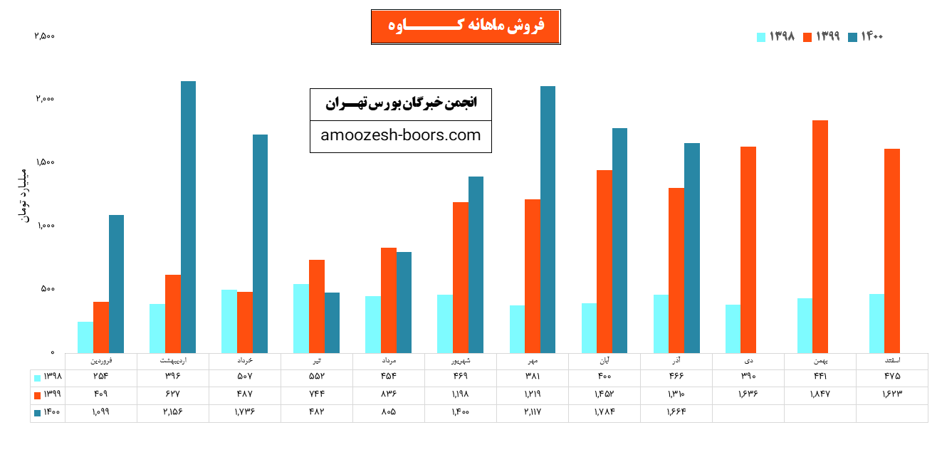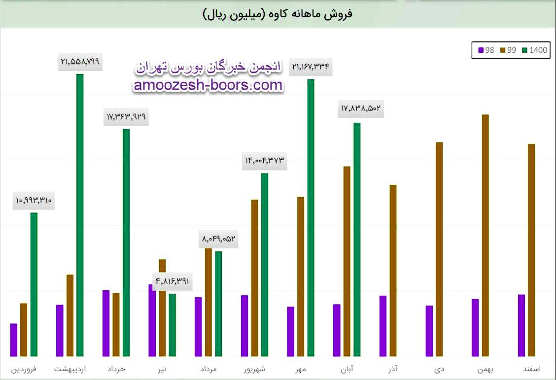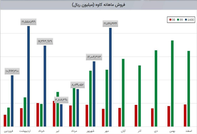 مبلغ فروش شرکت در هر کدام از دو فصل بهار و تابستان به ترتیب ۵۰۰۰ و ۲۷۰۰ میلیارد تومان بوده است و در فصل پاییز با رشد ۱۰۷ درصدی نسبت به تابستان به بیش از ۵۵۰۰ میلیارد تومان رسیده است. حاشیه سود ناخالص در این سه فصل به ترتیب برابر با ۲۰، ۲۳ و ۲۰ درصد بوده است.