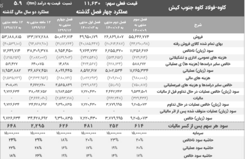 فولاد کاوه جنوب کیش دوره ۹ ماهه منتهی به آذر سال جاری را با سود خالص حدود ۲ هزار میلیارد تومانی (معادل ۱۳۴ تومان به ازای هر سهم) پشت سر گذاشت که ۲۰ درصد کمتر از دوره مشابه سال گذشته می باشد.