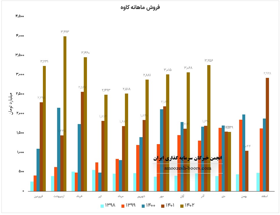 فروش آذر ماه سال 1402 سهم کاوه 32.56 میلیارد تومان گزارش شده است که 99% از این درآمد از طریق فروش داخلی و مابقی از طریق فروش صادراتی به دست آمده است، تغییرات درآمدی کاوه به شرح زیر میباشد: