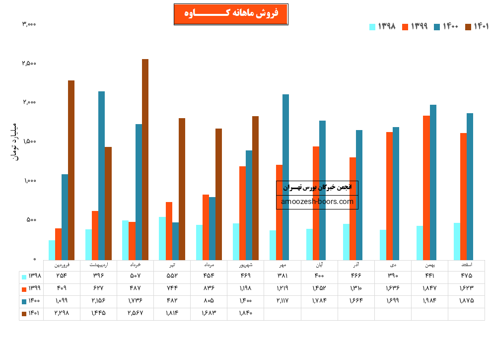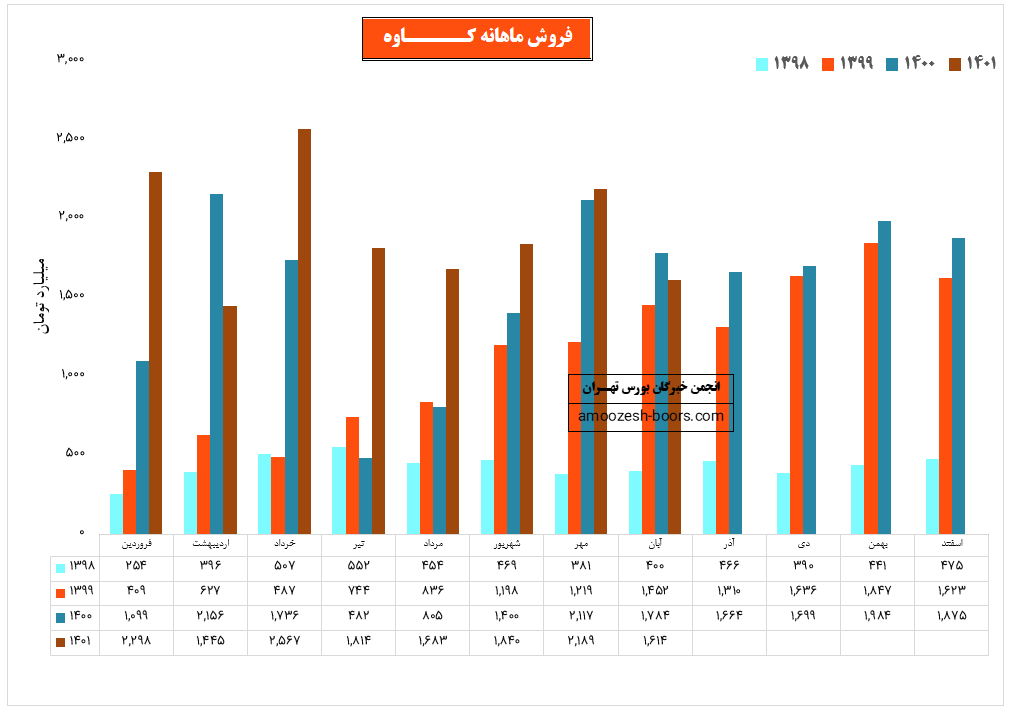نماد کاوه (شرکت فولاد کاوه جنوب کیش) در آبان ماه سال ۱۴۰۱ حدود مبلغ 1614 میلیارد تومان درآمد داشته که این میزان در مقایسه با ماه گذشته 26% و همچنین در مقایسه با مدت مشابه سال گذشته 10% کاهش درآمد داشته است.