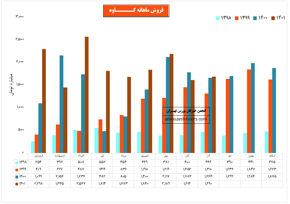 نماد کاوه در آذر ماه حدود 28 هزار تن فروش داخلی و همچنین حدود 94 هزار تن فروش صادراتی داشته است که در مقایسه با حجم فروش ماه گذشته حدود 33% کاهش در فروش داخلی و حدود 16% افزایش فروش صادراتی داشته است.