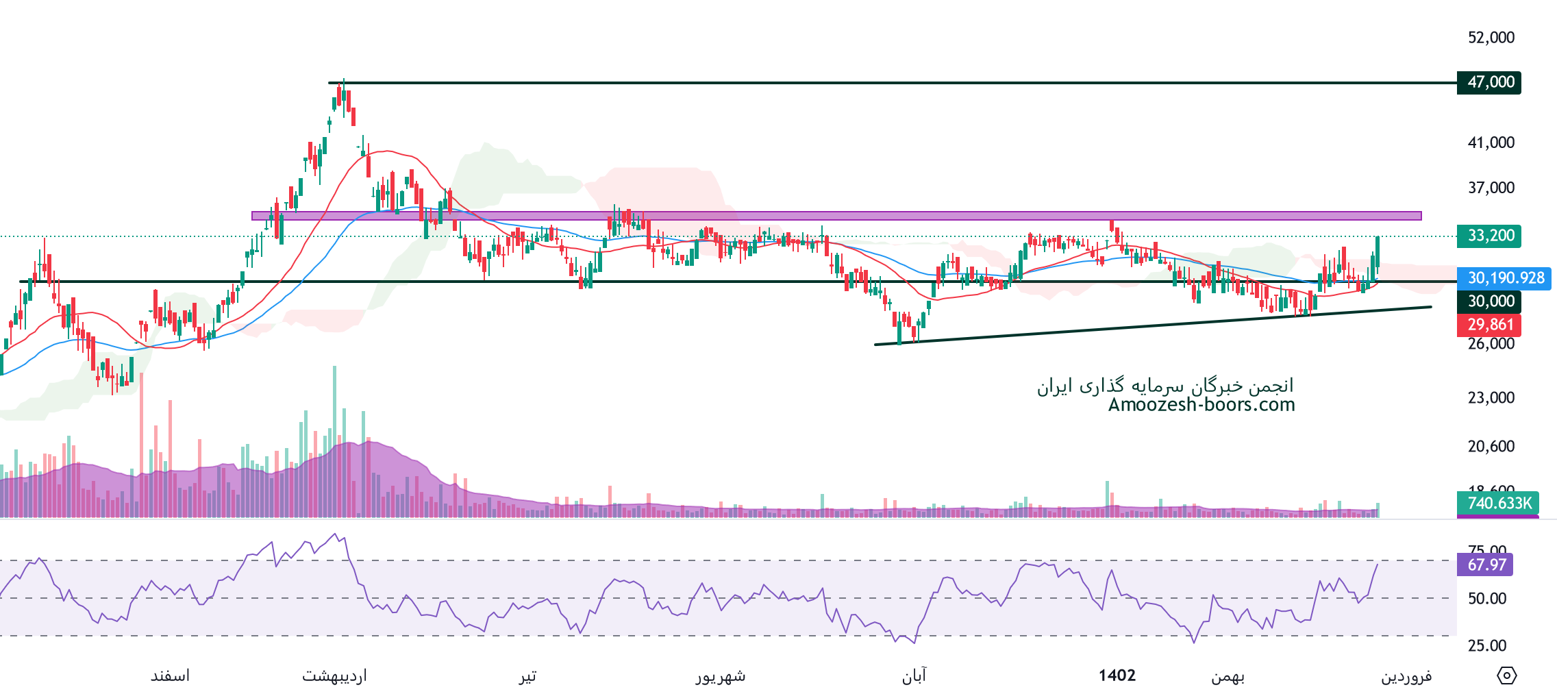 نماد کبافق در محدوده حمایتی 35000 ریال قرار دارد، در صورت ادامه دار شدن فشار عرضه و از دست رفتن این محدوده حمایتی، اصلاح تا 30000 ریال ادامه دار خواهد بود، همچنین در صورت تثبیت قیمت در این ناحیه، تارگت های سهم به ترتیب 46000 و 65000 ریال خواهند بود.