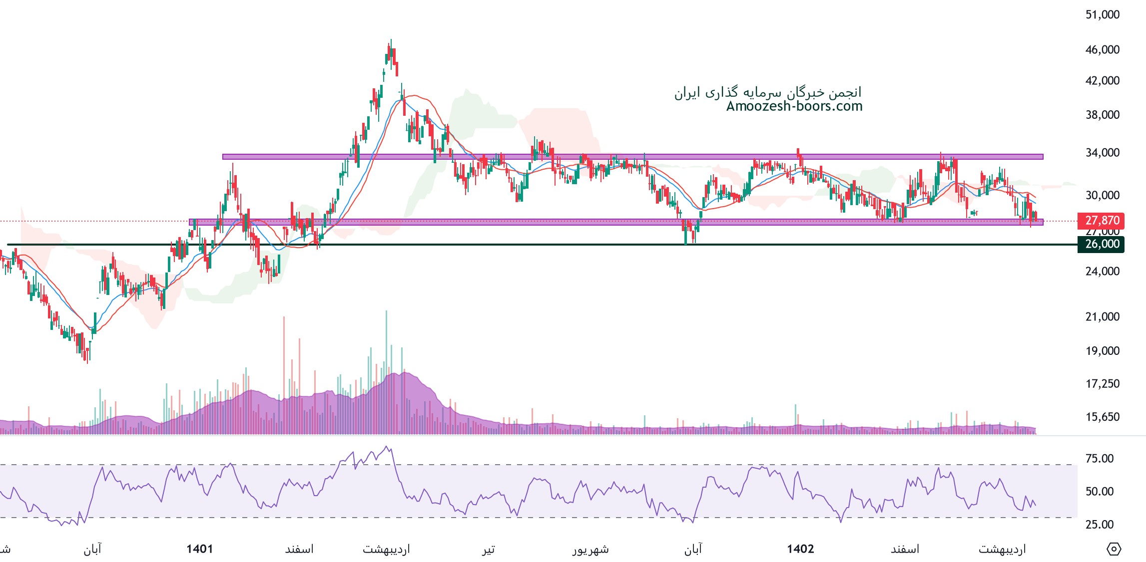بر اساس نمودار تکنیکال نماد کبافق ، قیمت در حال حاضر در کف حمایتی 26000 ریال و سقف مقاومتی 37000 ریال در نوسان میباشد، بهترین منطقه برای سیگنال ورود با دیدگاه کوتاه مدتی حمایت 26000 ریال میباشد و در صورت شکست این سطح حمایت بعدی سهم کبافق 21500 ریال در نظر گرفته خواهد شد، با توجه به شرایط بازار مقاومت کوتاه مدت محدوده 37000 برای سهم کبافق با اهمیت بوده و مقاومت بعدی کبافق تا قله تاریخی محدوده 45000 ریال میباشد.