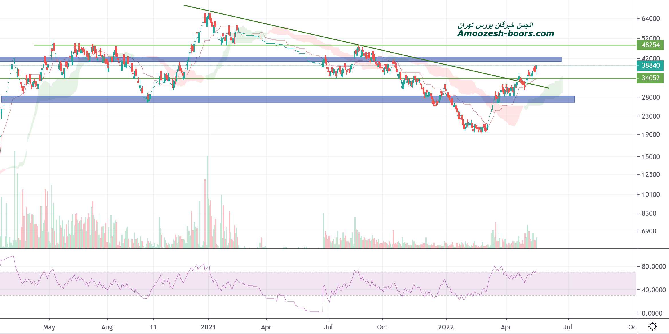 قیمت در حال نزدیک شدن به محدوده مقاومتی استاتیک میباشد،در صورت ادامه دار شدن حجم تقاضا و ادامه روند صعودی و شکست پر قدرت این مقاومت حرکت قیمت تا 48000 ریال محتمل میباشد و در صورت نزول سهم اولین حمایت 34000 ریال در نظر گرفته خواهد شد.