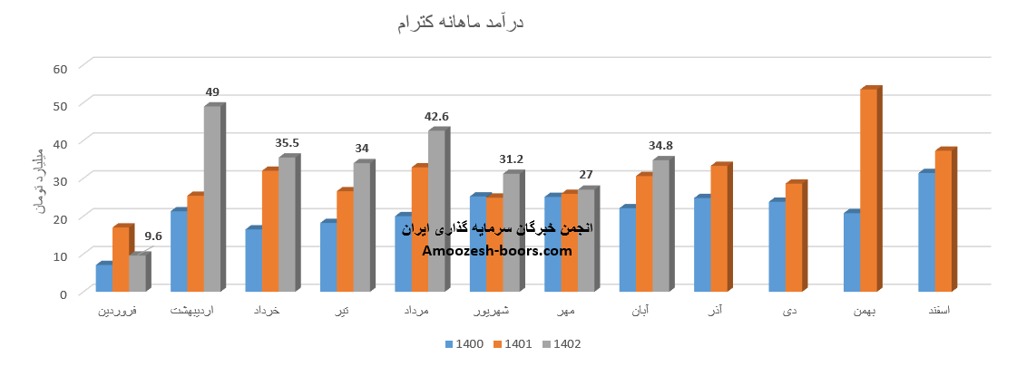 فروش آذر ماه سال 1402 سهم کترام 34.8 میلیارد تومان گزارش شده است که از این رقم 69% از محل فروش داخلی و مابقی آن از طریق فروش صادراتی تامین گردیده است، تغییرات درآمدی کترام به شرح زیر میباشد: