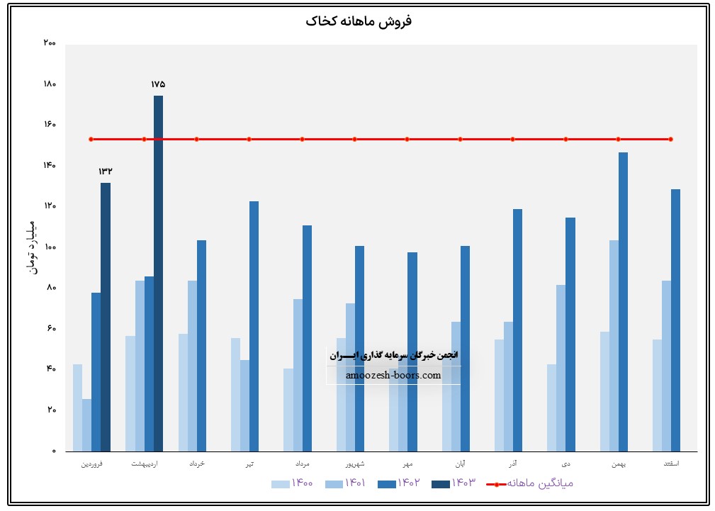 نماد کخاک (شرکت صنایع خاک چینی ایران) در اردیبهشت ماه 1403 حدود مبلغ 175 میلیارد تومان درآمد داشته که این میزان در مقایسه با ماه گذشته 33% و همچنین در مقایسه با مدت مشابه سال گذشته 103% رشد پیدا کرده است.