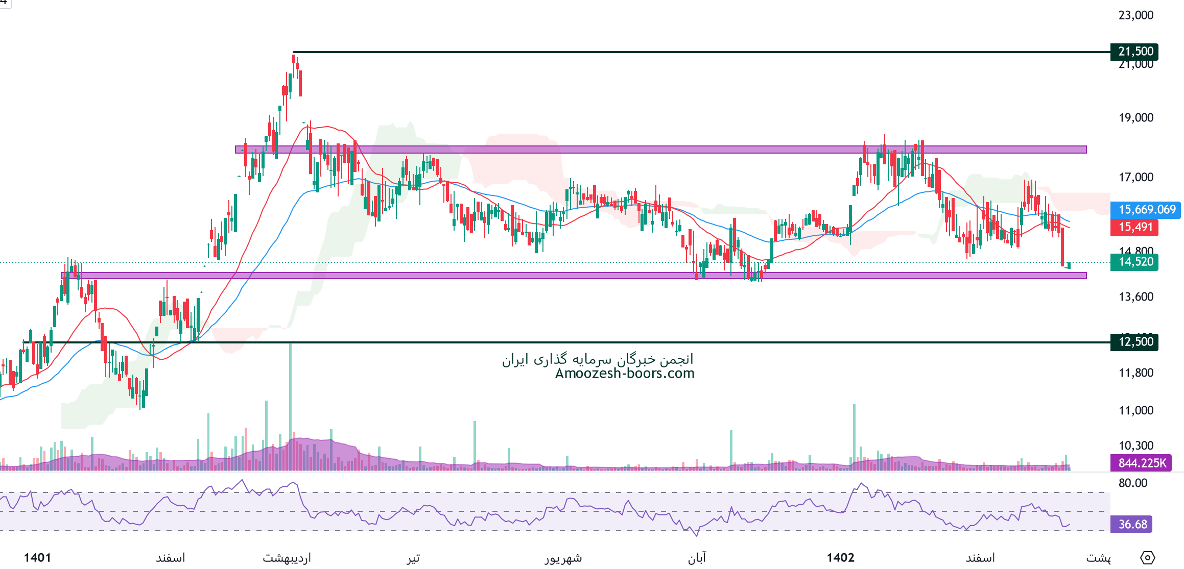 حمایت نماد کخاک از ناحیه پر تراکم 14000 ریال تشکیل شده و در صورت شکست این سطح تا حمایت بعدی سهم کخاک ( 12500 ریال ) 10% فاصله وجود دارد.