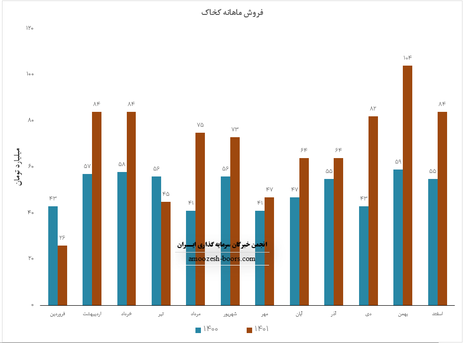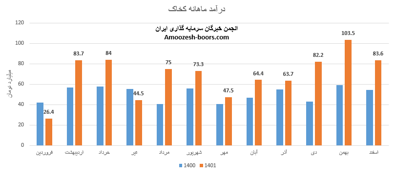 نماد کخاک با ثبت درامدی معادل با 83 میلیارد 600 میلیون تومان سال مالی خود را به اتمام رسانده، 14% از این درامد از طریق فروش صادراتی و مابقی از طریق فروش داخلی تامین شده، محصولات فرآوری شده بیشترین وزن سبد فروش سهم کخاک را تشکیل داده، که نسبت به ماه گذشته با کاهش 9 درصدی در نرخ فروش و مقدار فروش همراه بوده است.