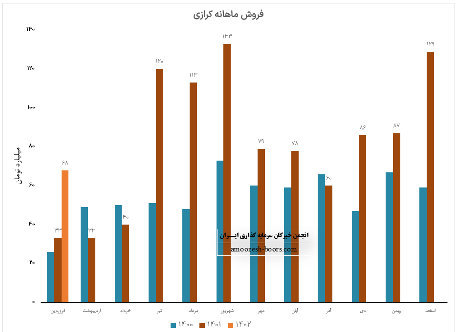 نماد کرازی (شرکت کارخانجات تولیدی شیشه دارویی رازی) در فروردین ماه سال ۱۴۰۲ حدود مبلغ 68 میلیارد تومان فروش داشته که این میزان در مقایسه با ماه گذشته 47% افت و همچنین در مقایسه با مدت مشابه سال گذشته 106% رشد درآمد داشته است.
