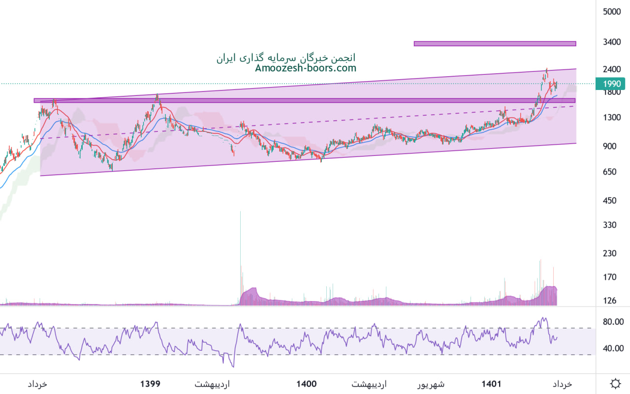 نماد کرازی بعد از برخورد به مقاومت سقف کانال صعودی و اصلاح نسبتا کمی که داشت به محدوده حمایتی 1600 ریال واکنش مثبت نشان داد و در حال حاضر مقاومت های 2300 و 3300 ریال را پیش روی خود دارد، همچنین محدوده حمایتی بعدی 1200 ریال در نظر گرفته خواهد شد.