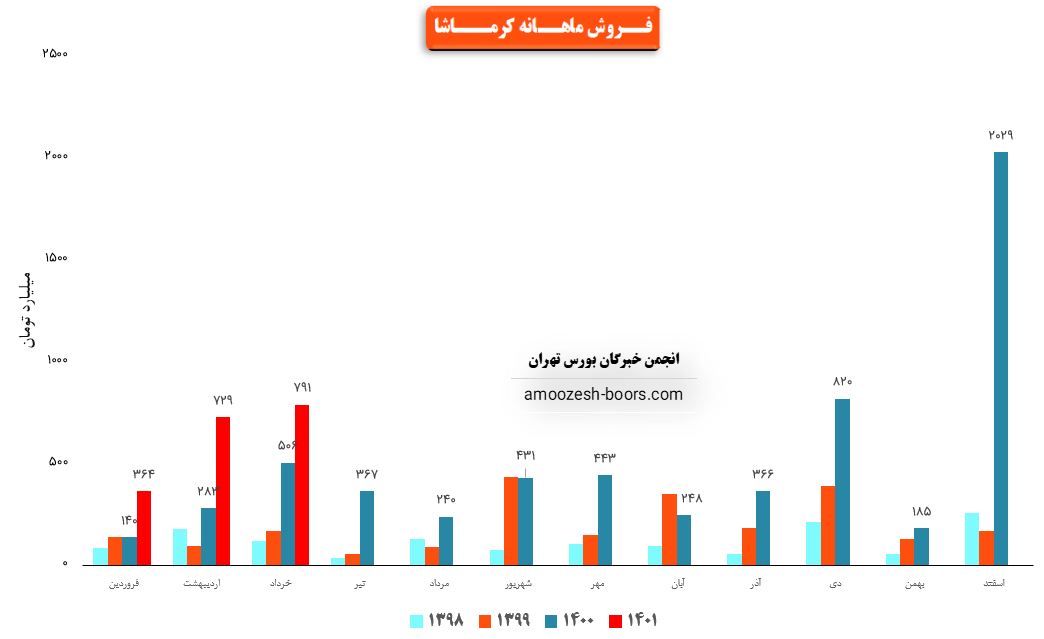 فروش نماد کرماشا: 6111 میلیارد تومان که نسبت به دوره مشابه گذشته 154% افزایش یافته است.