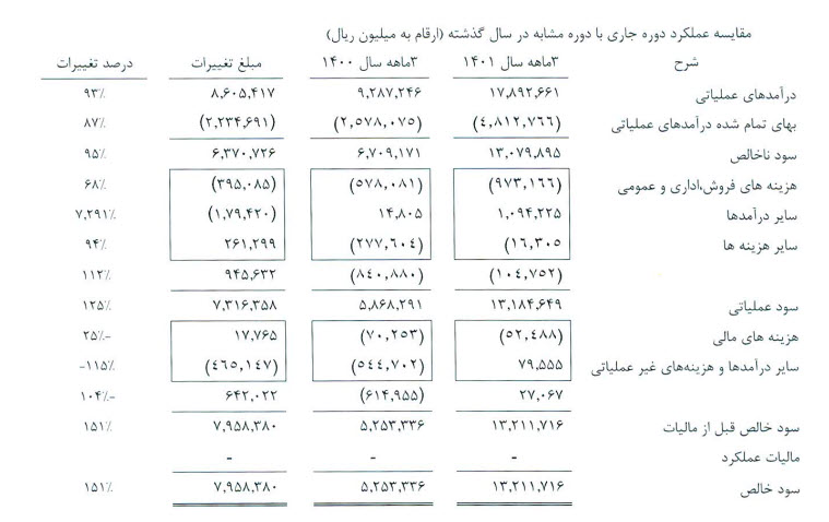 سود ناخالـص: 3966 میلیارد تومان که نسبت به دوره مشابه گذشته 142% افزایش یافته است.