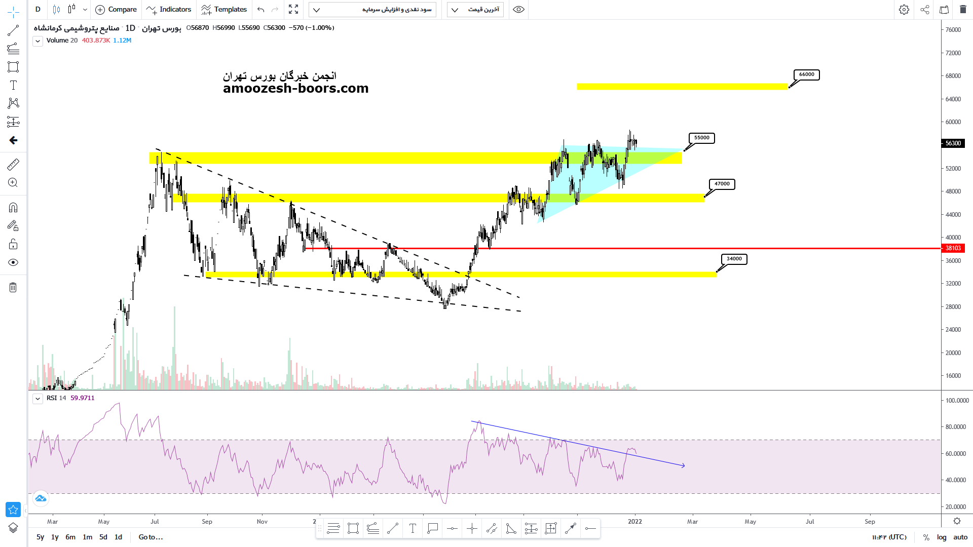 اما با توجه به واگرایی نزولی اندیکاتور هر گونه سرمایه گذاری بر روی نماد پر ریسک محسوب میشود زیرا که درصورت عدم رشد و برگشت به زیر حمایت 5500 قیمت میتواند تا محدوده 4700 نیز نزول خود را ادامه دهد
