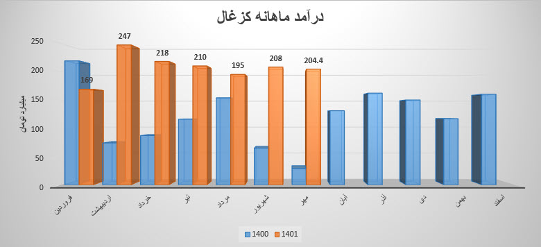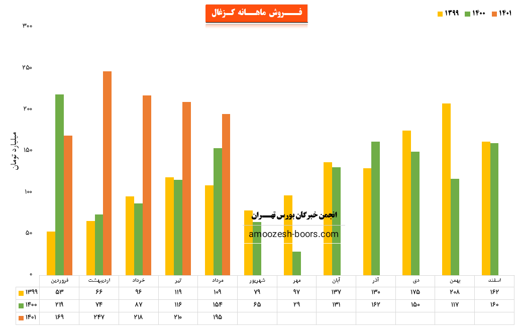 کزغال در مهر ماه معادل 204.4 میلیارد تومان از محصولات خود را به فروش رسانده است که نسبت به دوره 1 ماهه مشابه سال قبل 599% افزایش و نسبت به ماه قبل 2% کاهش و نسبت به میانگین ماه های گذشته نیز 1.6% کاهش داشته است.