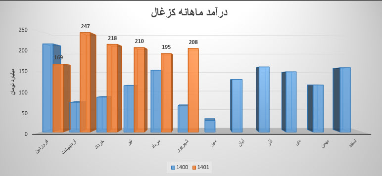 کزغال (زغال سنگ پروده طبس) در مرداد ماه ۱۴۰1 حدود مبلغ 195 میلیارد تومان درآمد داشته که این میزان در مقایسه با ماه گذشته 7% کاهش و همچنین در مقایسه با مدت مشابه سال گذشته 27% رشد درآمد پیدا کرده است.