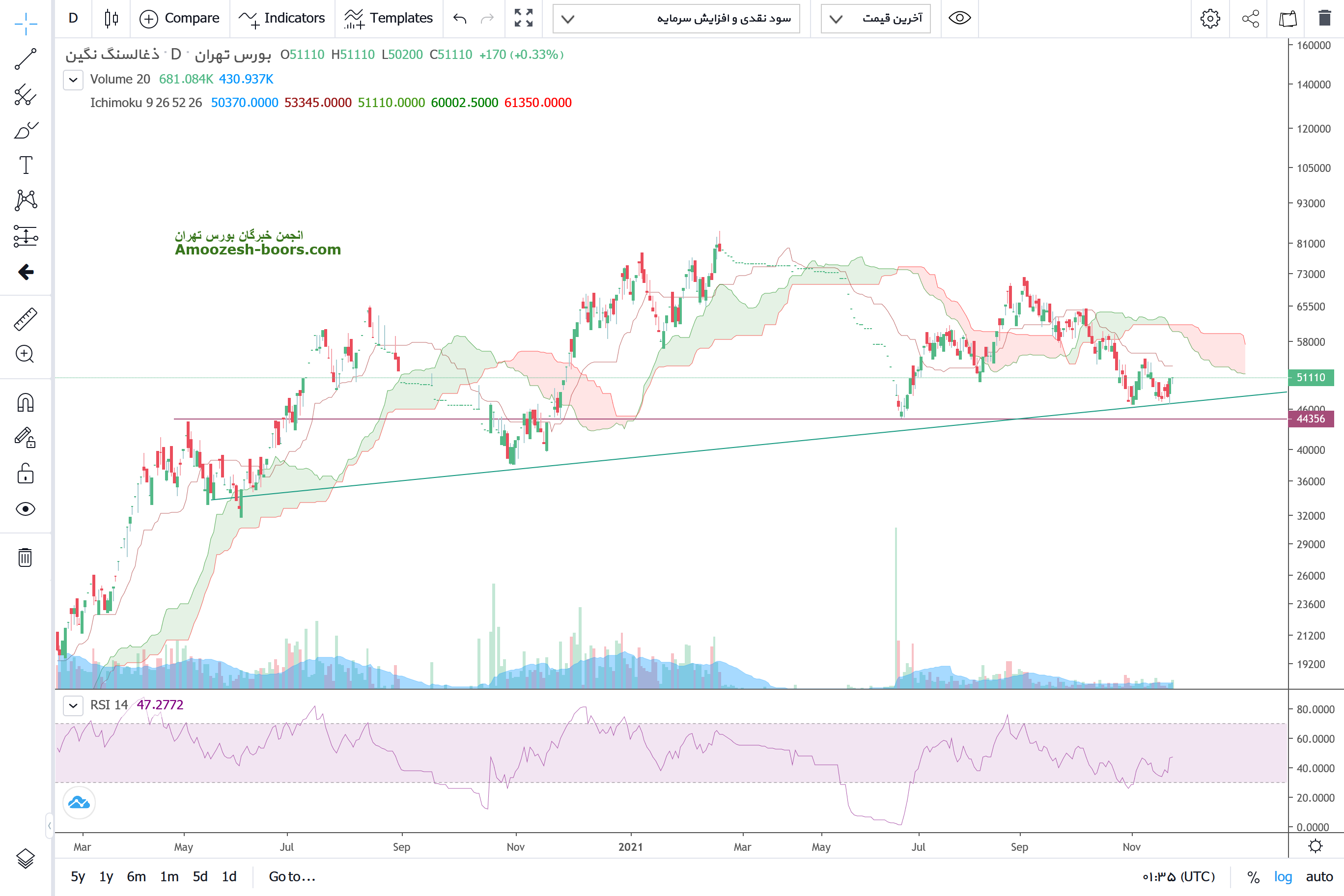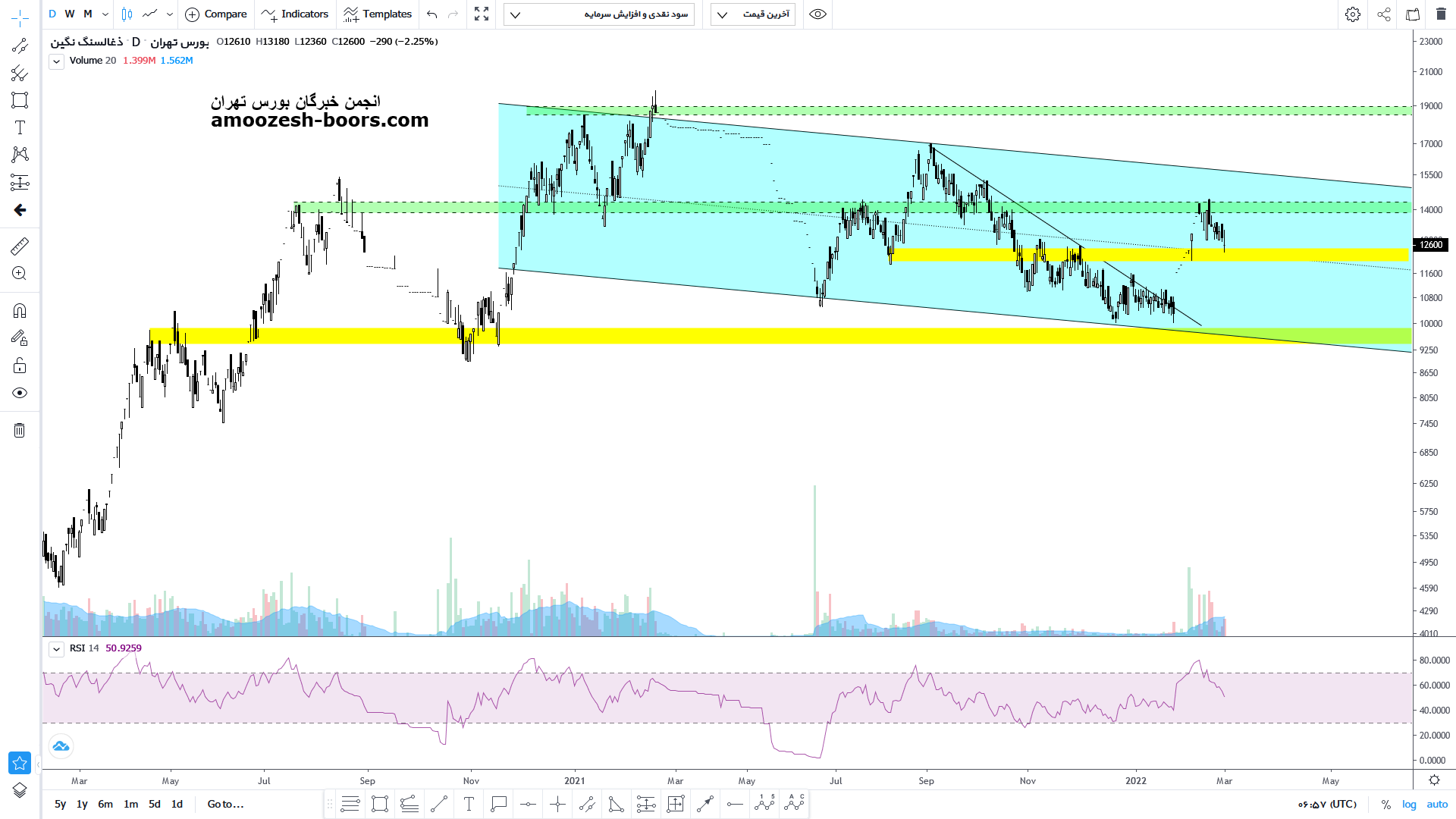 قیمت پس از شکست خط روند نزولی خود رشدی را تا مقاومت محدوده ۱۴۰۰ تومان داشته و پس از بروز واکنش منفی اصلاحی را مجددا آغاز کرد. اکنون محدوده حمایتی ۱۲۶۰ تومان را پیش روی خود دارد که در صورت حمایت از این محدوده میتواند مجدداً مقاومت ۱۴۰۰ تست کرده تا در صورت شکست رشد خود را تا محدوده سقف کانال نیز ادامه دهد. اما در صورت شکست محدوده حمایتی ۱۲۶۰ تومان این اصلاح تا محدوده کف کانال متواند ادامه داشته باشد.