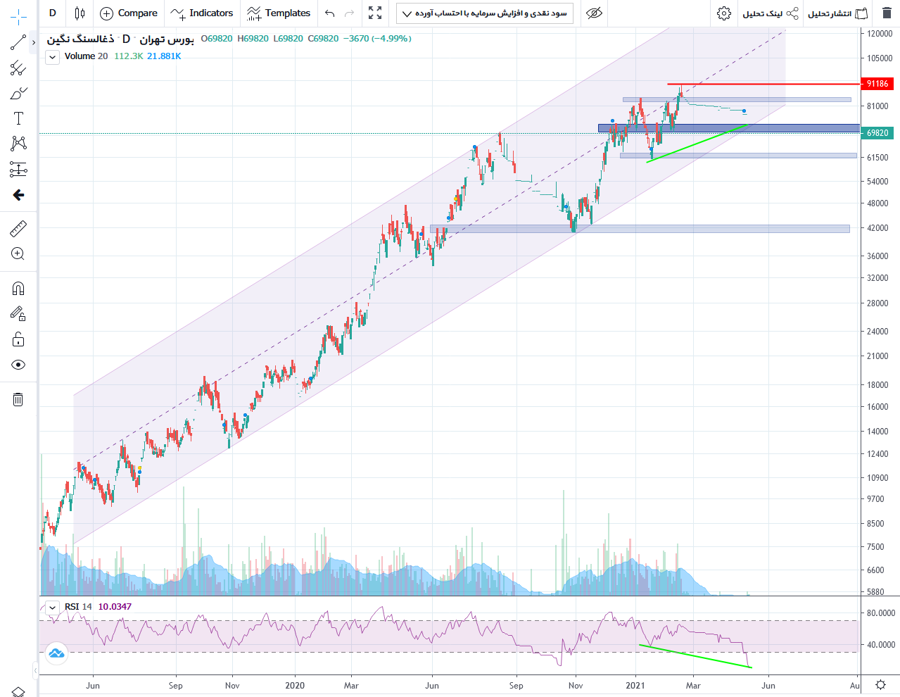 این سهم در یک کانال بلند مدت در حال نوسان بوده که جدیدا از ان خارج شده البته با توجه به قرارگیری یک محدوده مقاومتی که هم قیمت چندین بار به ان واکنش نشان داده و هنوز این محدوده را نشکانده و یک واگرایی که در حال تشکیل است ( البته تا زمانی که کف در نمودار تشکیل نشود خیلی قابل استناد نیست ) و قسمت در ار اس ای در محل اشباه فروش قرار دارد هنوز میتوان به برگشت قیمت امید داشت . در صورت شکست این محدوده محدوده حمایتی بعدی قیمت6000 تا 6200 تومان میباشد!!