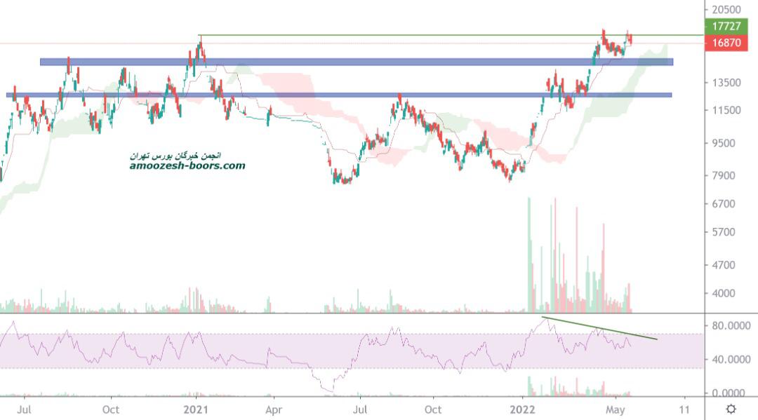 چارت کمنگنز با توجه به واگرایی منفی و درگیری قیمت در منطقه مقاومتی پر ریسک ارزیابی میگردد، در صورت فشار فروش اولین منطقه حمایتی 15000 ریال و در صورت شکست قله تاریخی تارگت 21000 ریال بر سر راه سهم قرار دارد .