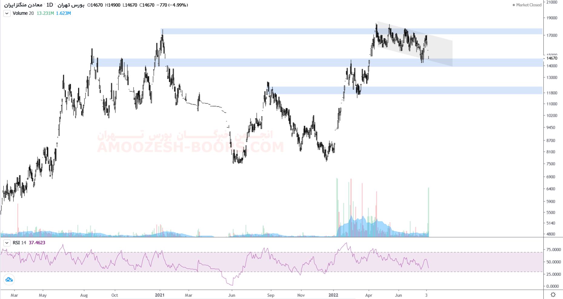 قیمت سهم کمنگنز پس از برخورد به سقف کانال نزولی کوتاه مدت خود با بروز واکنش منفی نسبت به این ناحیه مقاومت ای وارد اصلاح شده و اکنون نیز ناحیه حمایتی قوی 1400 تومان را پیش روی خود دارد که می تواند در صورت حمایت مجدد تا سقف کانال رشد کند تا در صورت شکست آن بتواند سقف تاریخی 1750 تومان را نیز ببیند اما در صورت از دست دادن این ناحیه حمایتی نماد كمنگنز می تواند اصلاح خود را تا ناحیه حمایتی ۱۲۰۰ تومان ادامه خواهد داد.