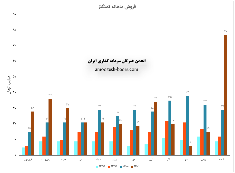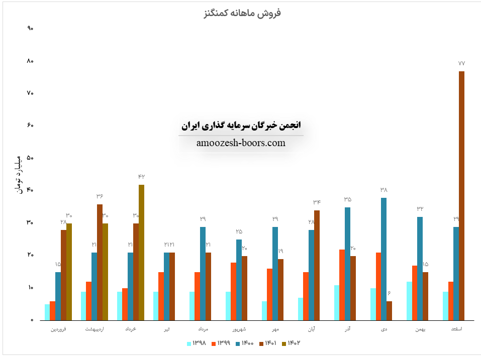 شرکت کمنگنز (معادن منگنز ایران) در اسفند ماه ۱۴۰1 حدود مبلغ 77 میلیارد تومان درآمد داشته که این میزان در مقایسه با ماه گذشته 413 درصد و همچنین در مقایسه با مدت مشابه سال گذشته 166 درصد رشد پیدا کرده است.