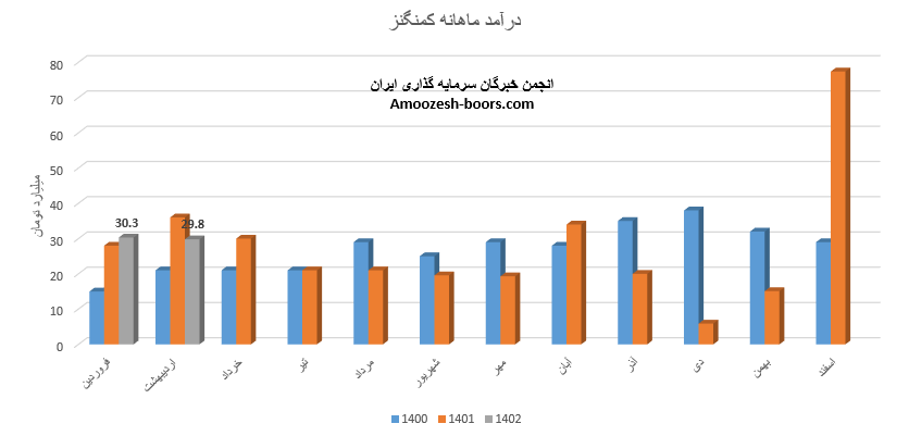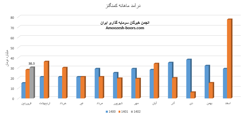 معادن منگنز ایران با نماد کمنگنز با ثبت درآمد 30.3 میلیارد تومانی سال مالی خود را آغاز نمود، تمامی درآمد فروردین ماه سال 1402 سهم کمنگنز از طریق فروش داخلی تامین شده است و افزایش 8 درصدی نسبت به مدت مشابه سال قبل داشته است، پر فروش ترین محصول سهم کمنگنز سنگ منگنز دانه بندی میباشد که نرخ فروش این محصول 20%، میزان فروش 41% و میزان تولید 19% نسبت به ماه قبل کاهش داشته است.