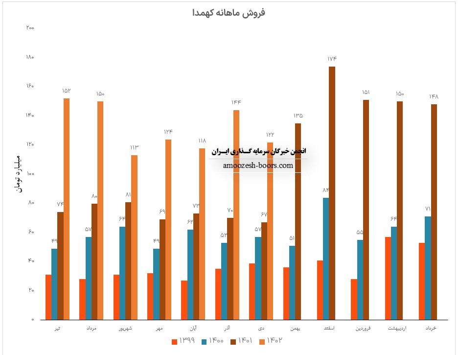 فروش آذر ماه سال 1402 سهم کهمدا 144.1 میلیارد تومان گزارش شده است که از این مبلغ 73% از محل فروش داخلی و مابقی آن از محل فروش صادراتی تامین گردیده است، تغییرات درآمدی کهمدا به شرح زیر میباشد:
