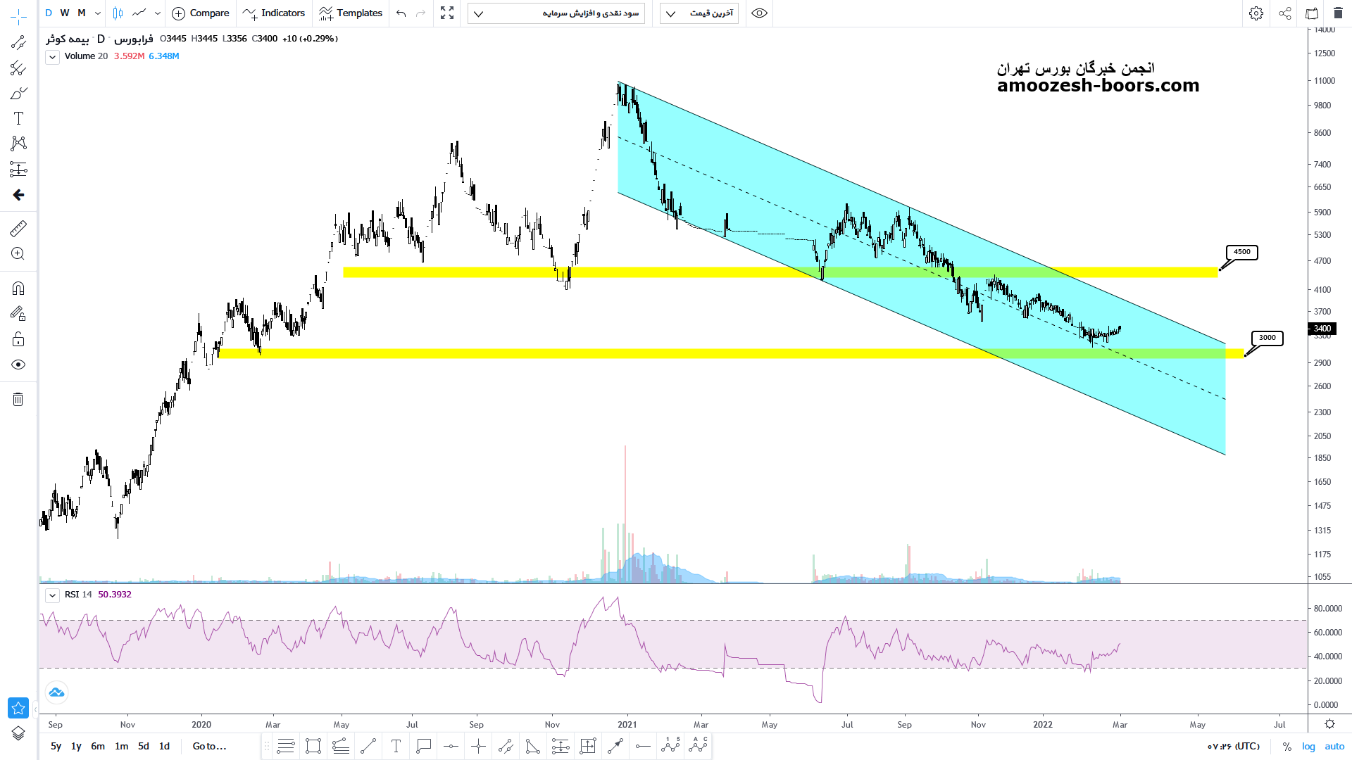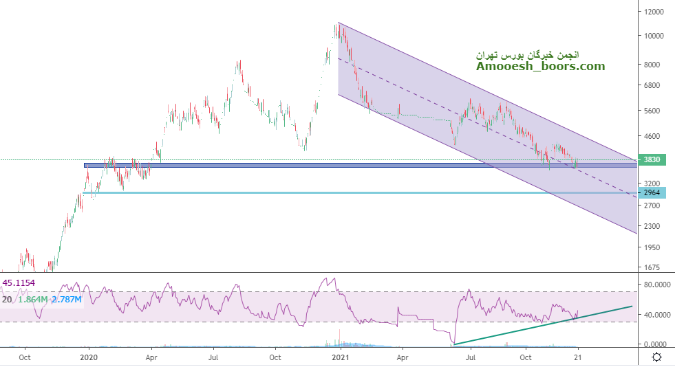 در صورت قرار دادن اصلاح قیمت درون یک کانال نزولی مشاهده می کنیم که چطور قیمت به خط میانی کانال واکنشهایی را از خود نشان میدهد. با توجه به فشردگی قیمت در روزهای اخیر و کاهش حجم معاملات مقاومت پیشروی قیمت محدوده سقف کانال نزولی می باشد که در صورت شکست آن می تواند تا محدوده مقاومتی ۴۵۰ تومان نیز رشد خود را ادامه دهد. اما در صورت برگشت مجدد و شکست محدوده حمایتی ۳۰۰تومان میتواند نزولی را تا محدوده کف کانال نزولی داشته باشد.